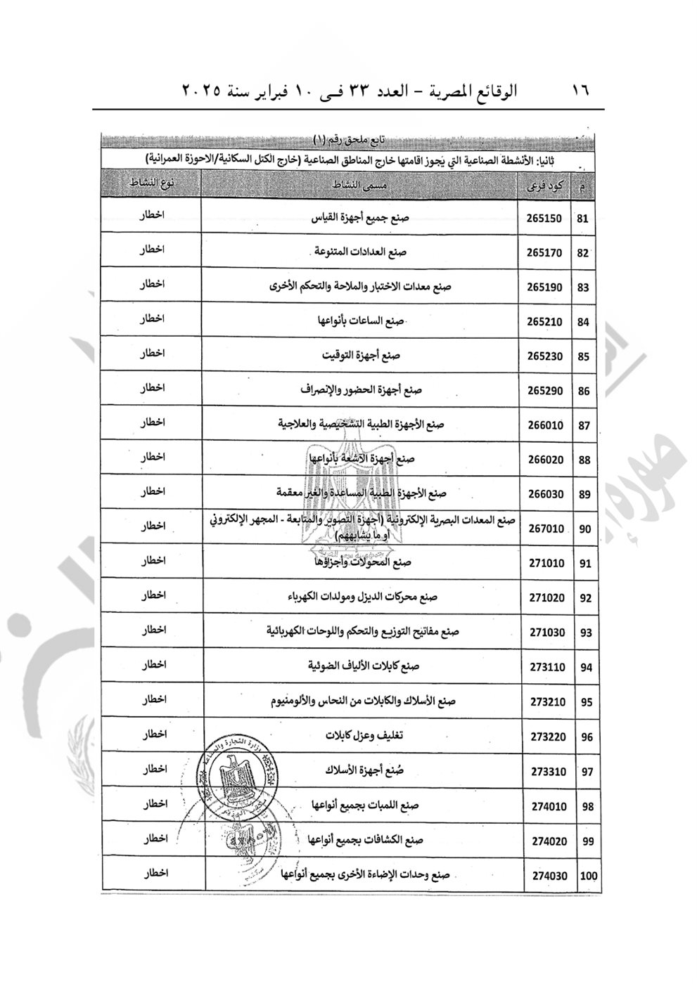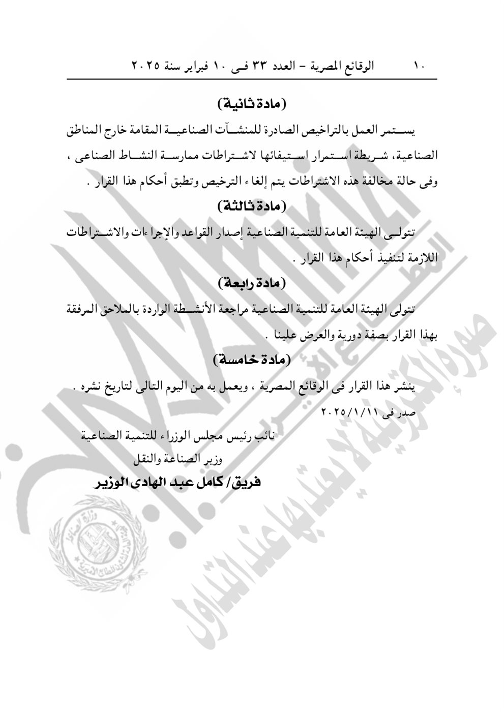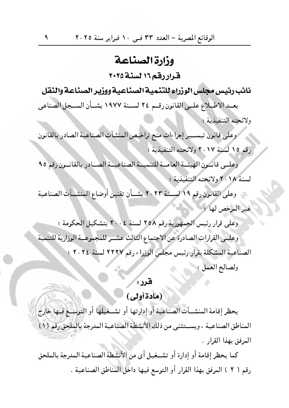 نشرت جريدة الوقائع المصرية في عددها رقم 33، الصادر في 10 فبراير 2025، قرار وزارة الصناعة رقم 16 لسنة 2025، بشأن حظر إقامة المنشآت الصناعية أو إدارتها أو تشغيلها أو التوسع فيها خارج المناطق الصناعية.
