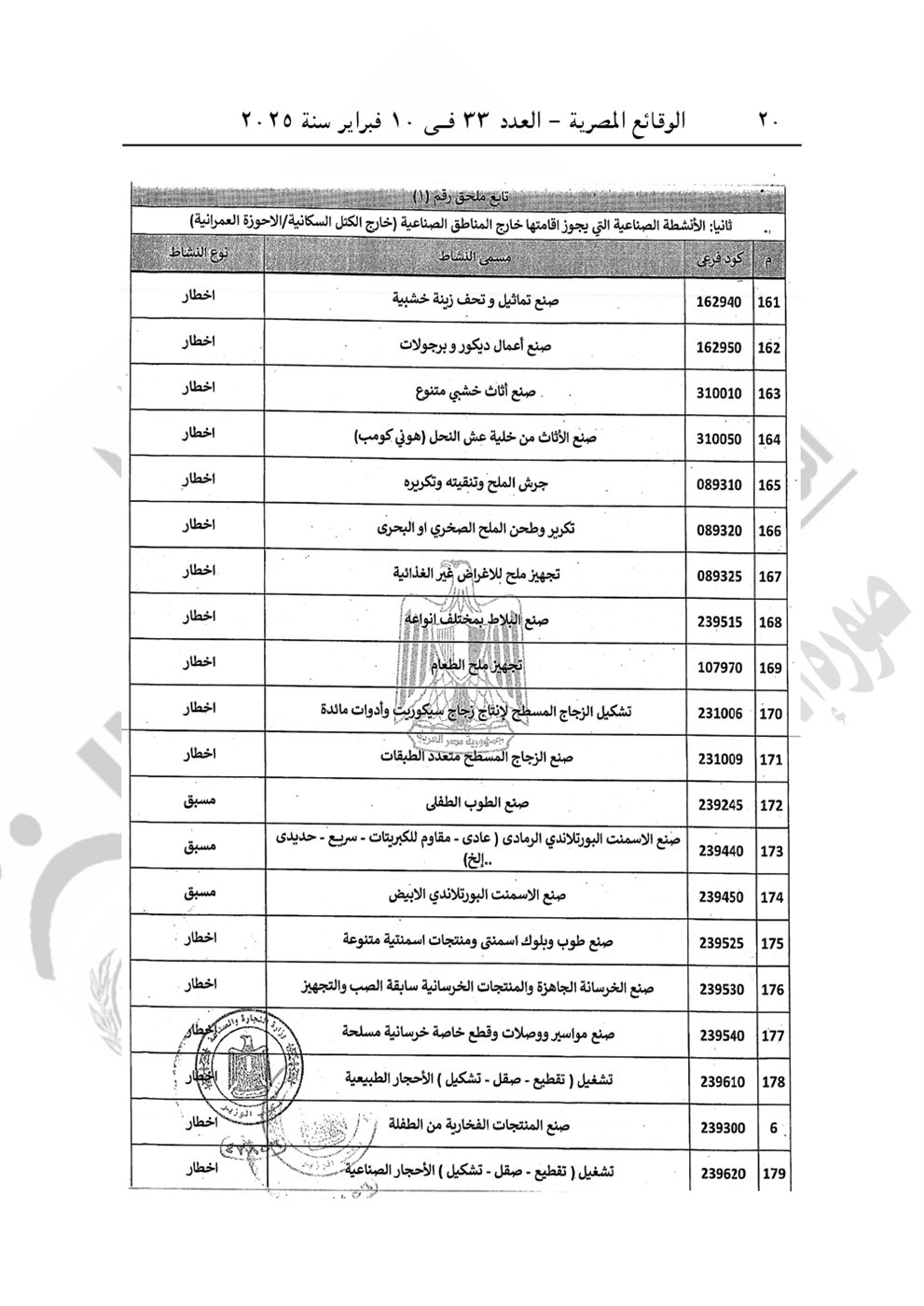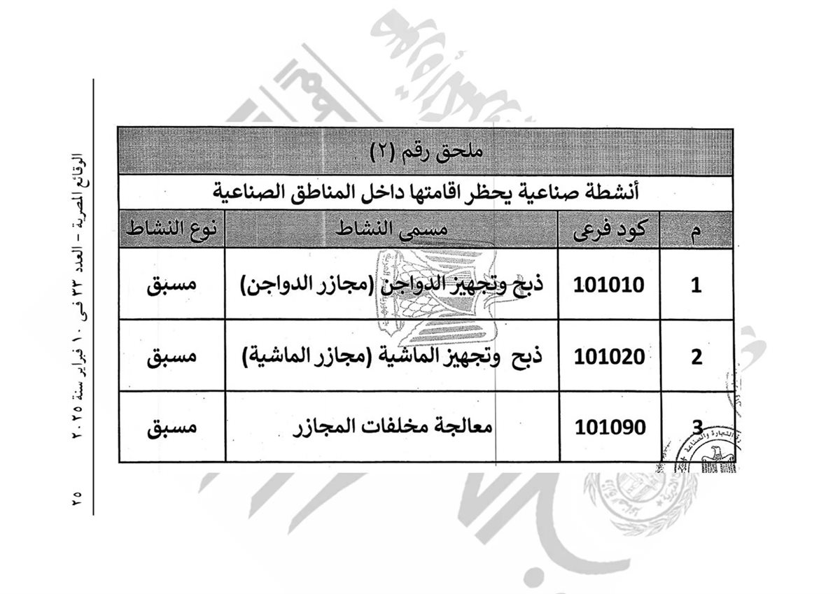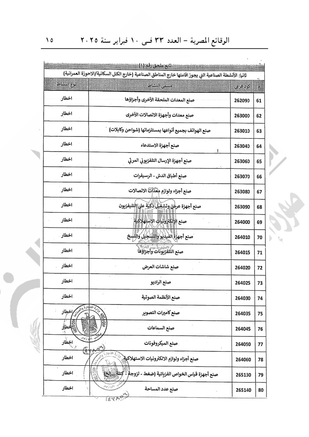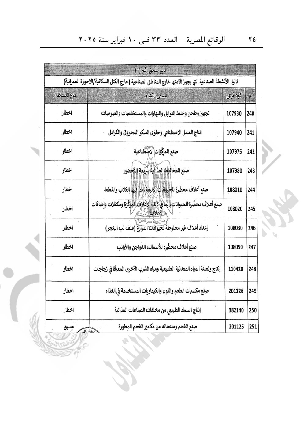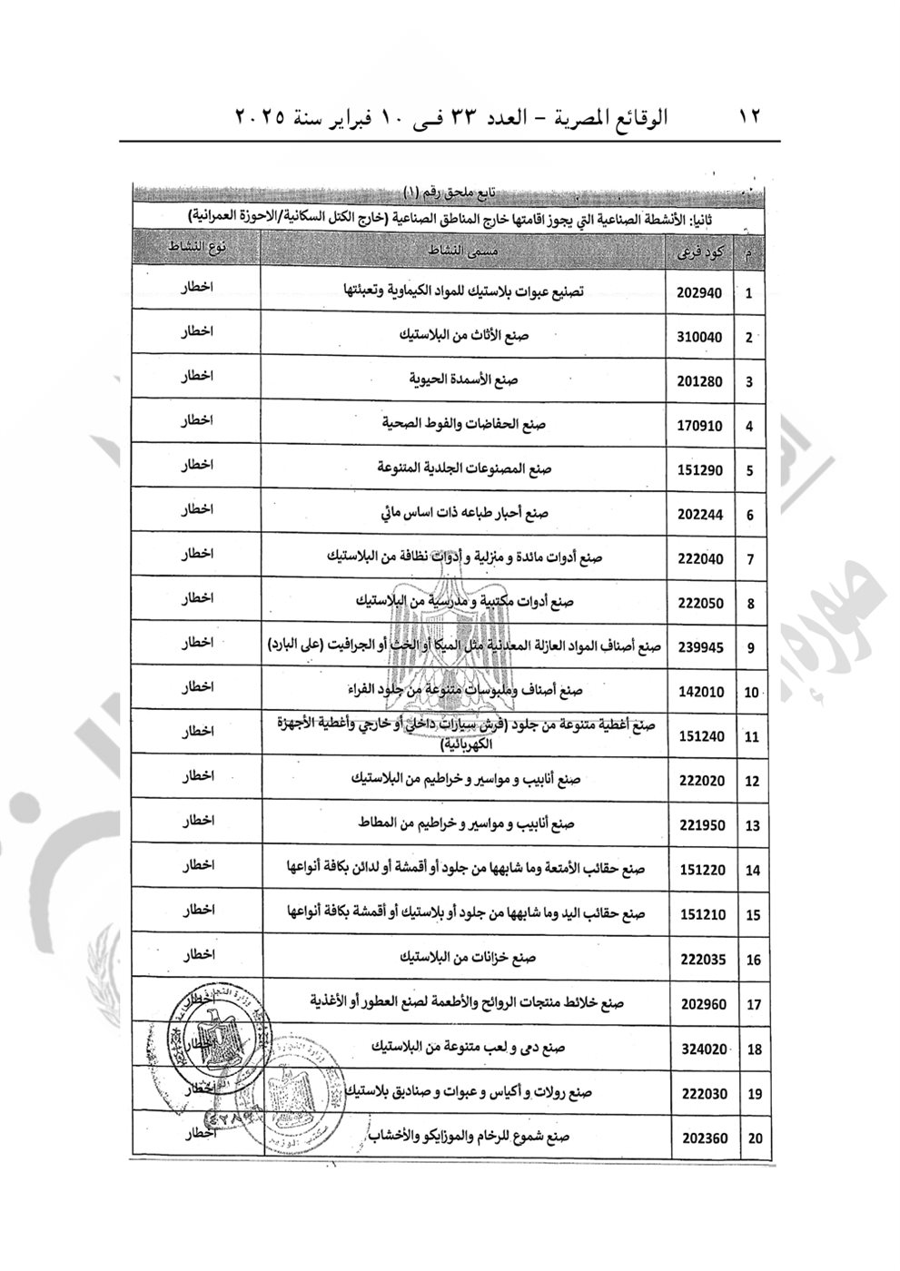 كما يحظر إقامة أو إدارة أو تشغيل أى من الأنشطة الصناعية المدرجة بالملحق رقم (۲) المرفق بهذا القرار أو التوسع فيها داخل المناطق الصناعية.