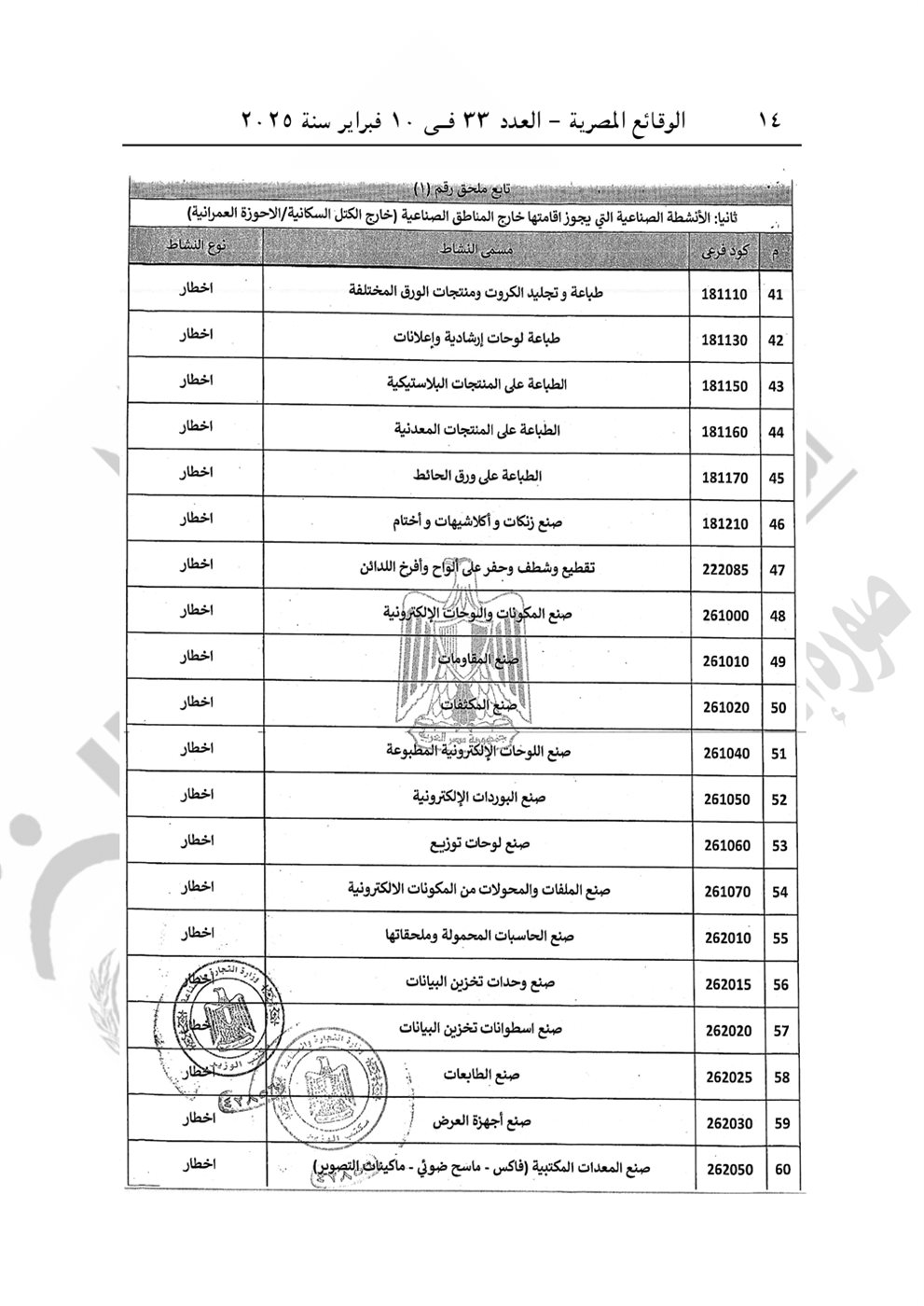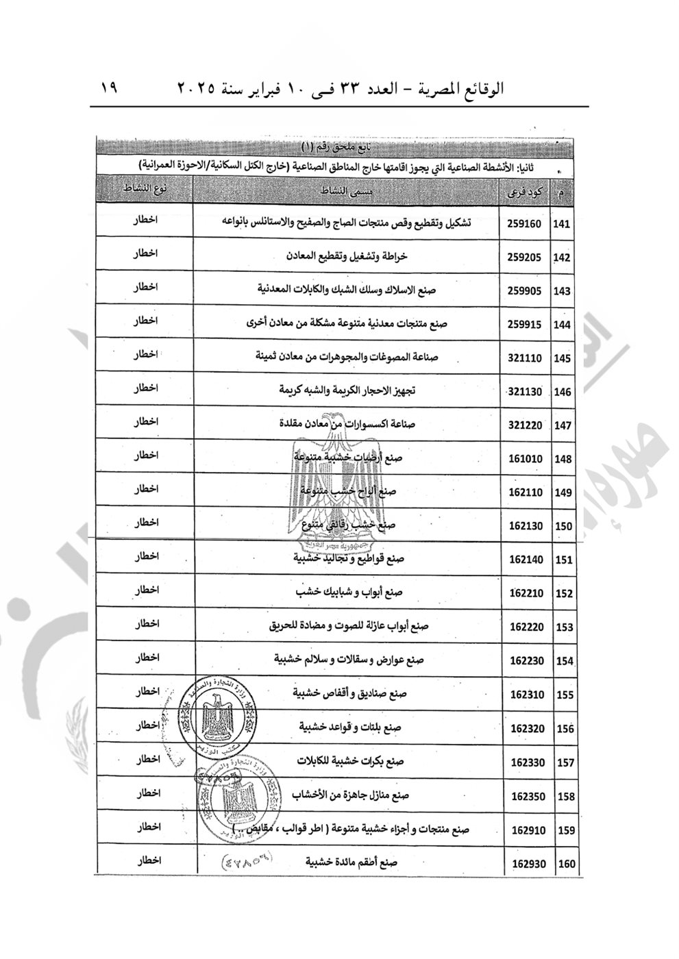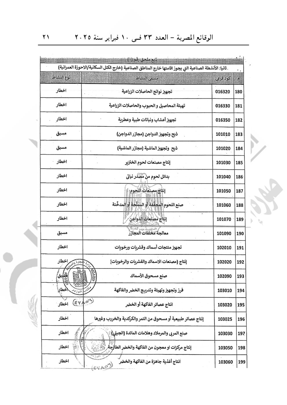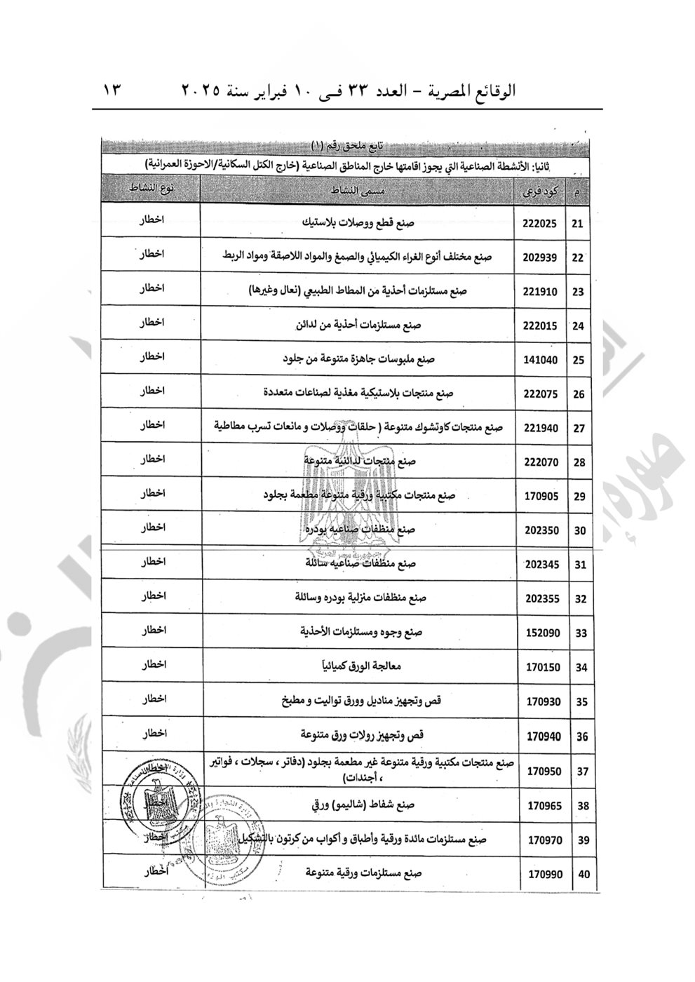 كما يحظر إقامة أو إدارة أو تشغيل أى من الأنشطة الصناعية المدرجة بالملحق رقم (۲) المرفق بهذا القرار أو التوسع فيها داخل المناطق الصناعية.