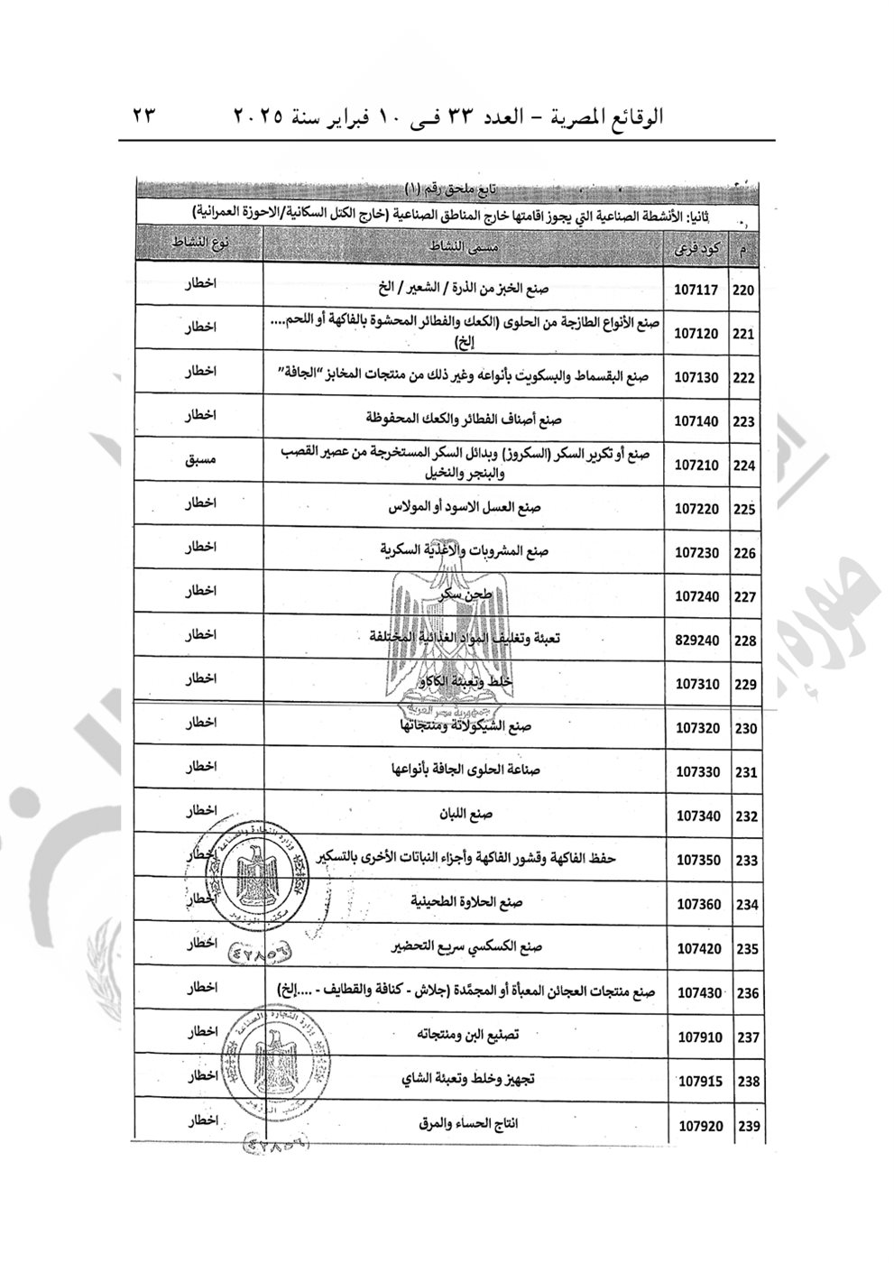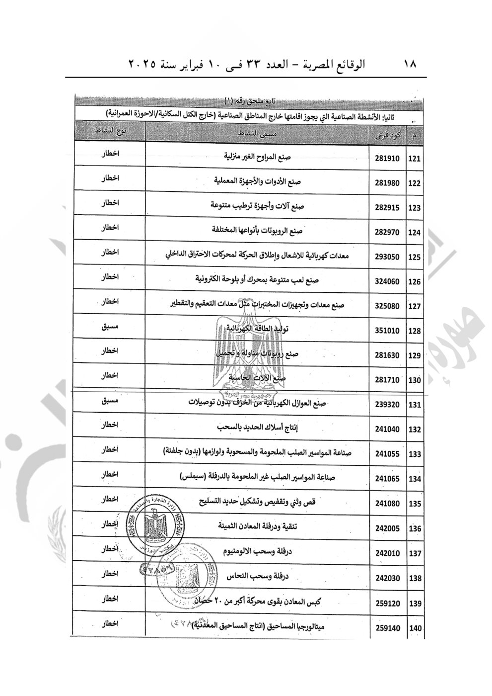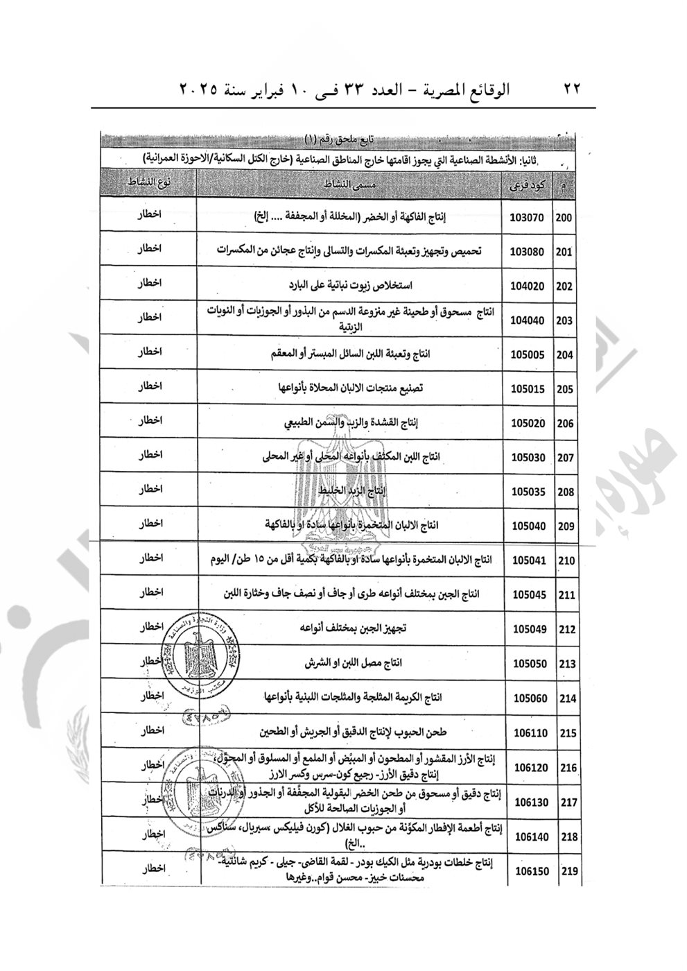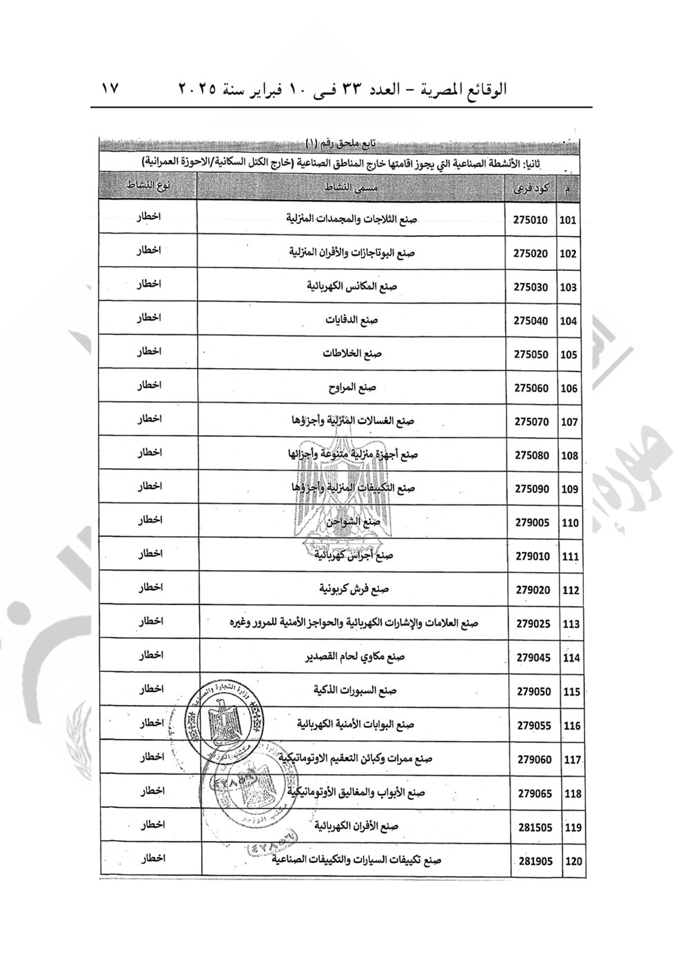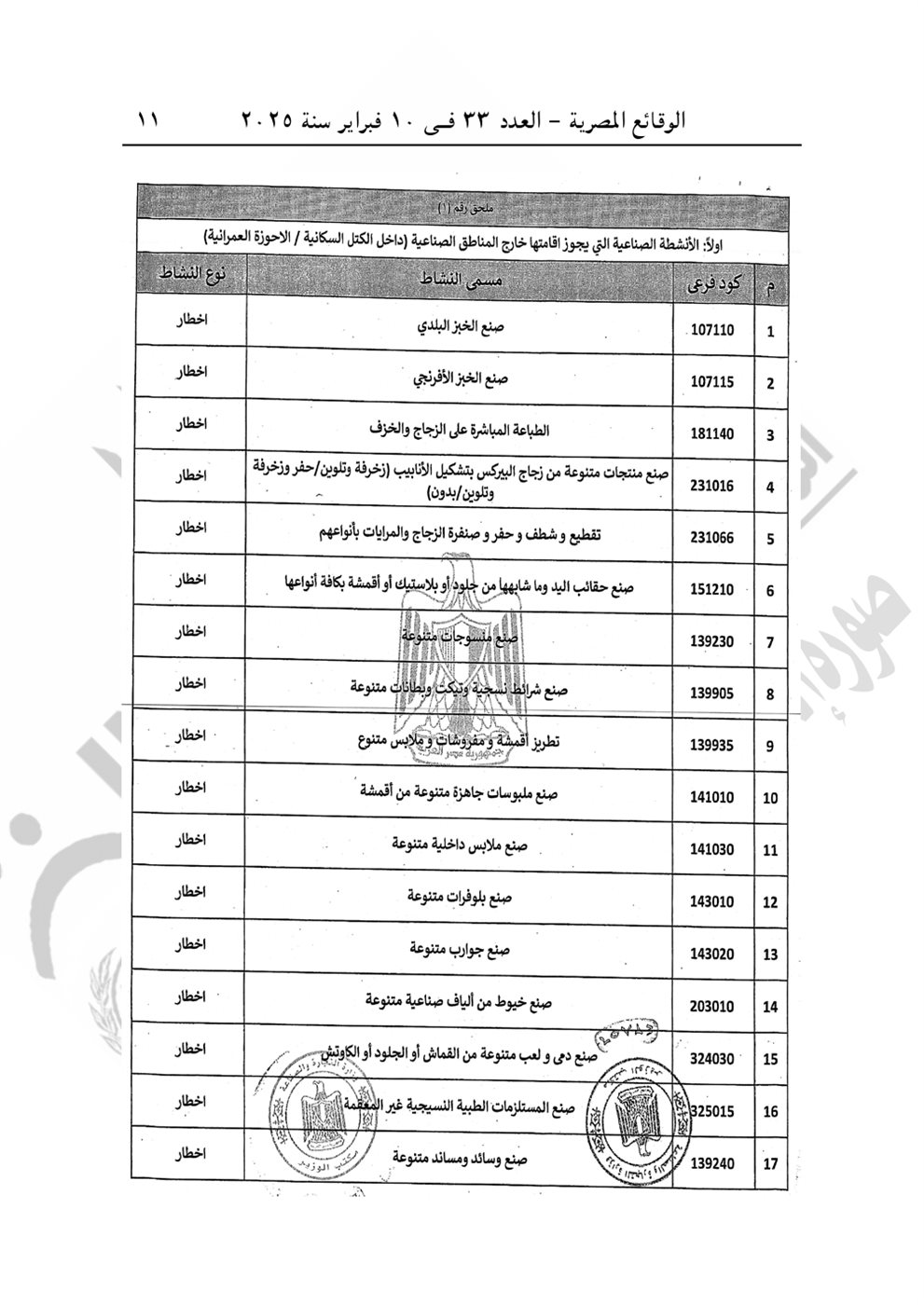 كما يحظر إقامة أو إدارة أو تشغيل أى من الأنشطة الصناعية المدرجة بالملحق رقم (۲) المرفق بهذا القرار أو التوسع فيها داخل المناطق الصناعية.