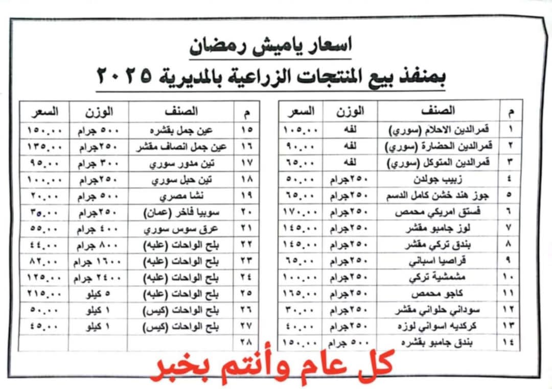 وتشمل قائمة الأصناف أصنافًا متعددة من التمر، والمكسرات، والفواكه المجففة، حيث جاء سعر قمر الدين السوري بين 65 و105 جنيهات للفة، وسعر الزبيب الجولدن 50 جنيهًا لـ 250 جرامًا، بينما بلغ سعر عين الجمل بالقشر 150 جنيهًا لكل 500 جرام.
