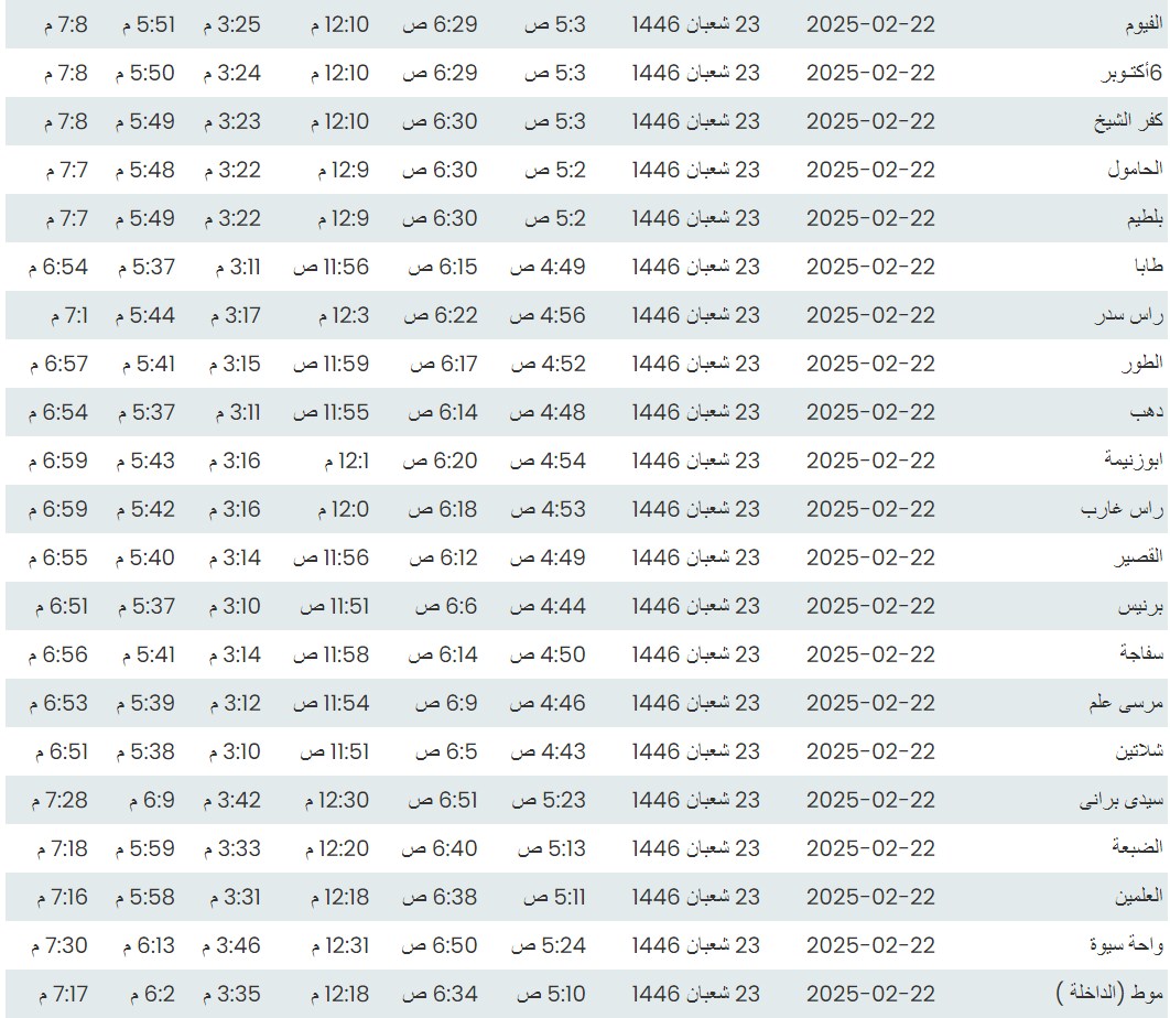 وفيما يلي مواقيت الصلاة، لعدد من مدن ومحافظات الجمهورية من واقع بيانات الهيئة العامة للمساحة