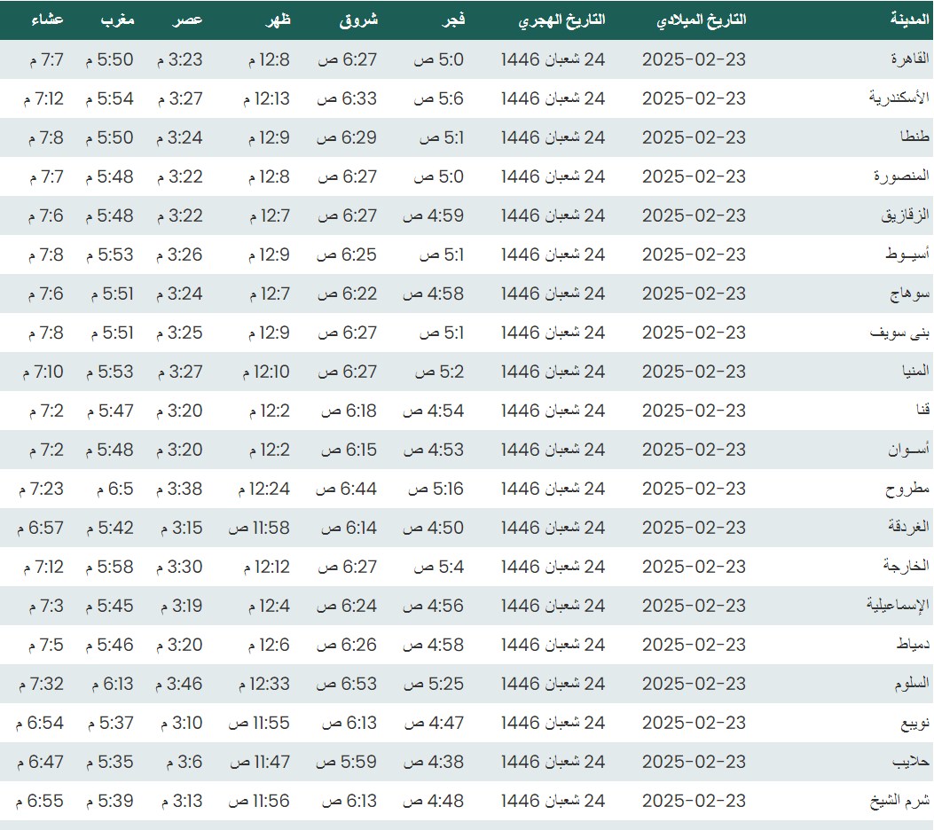 وفيما يلي مواقيت الصلاة، لعدد من مدن ومحافظات الجمهورية من واقع بيانات الهيئة العامة للمساحة