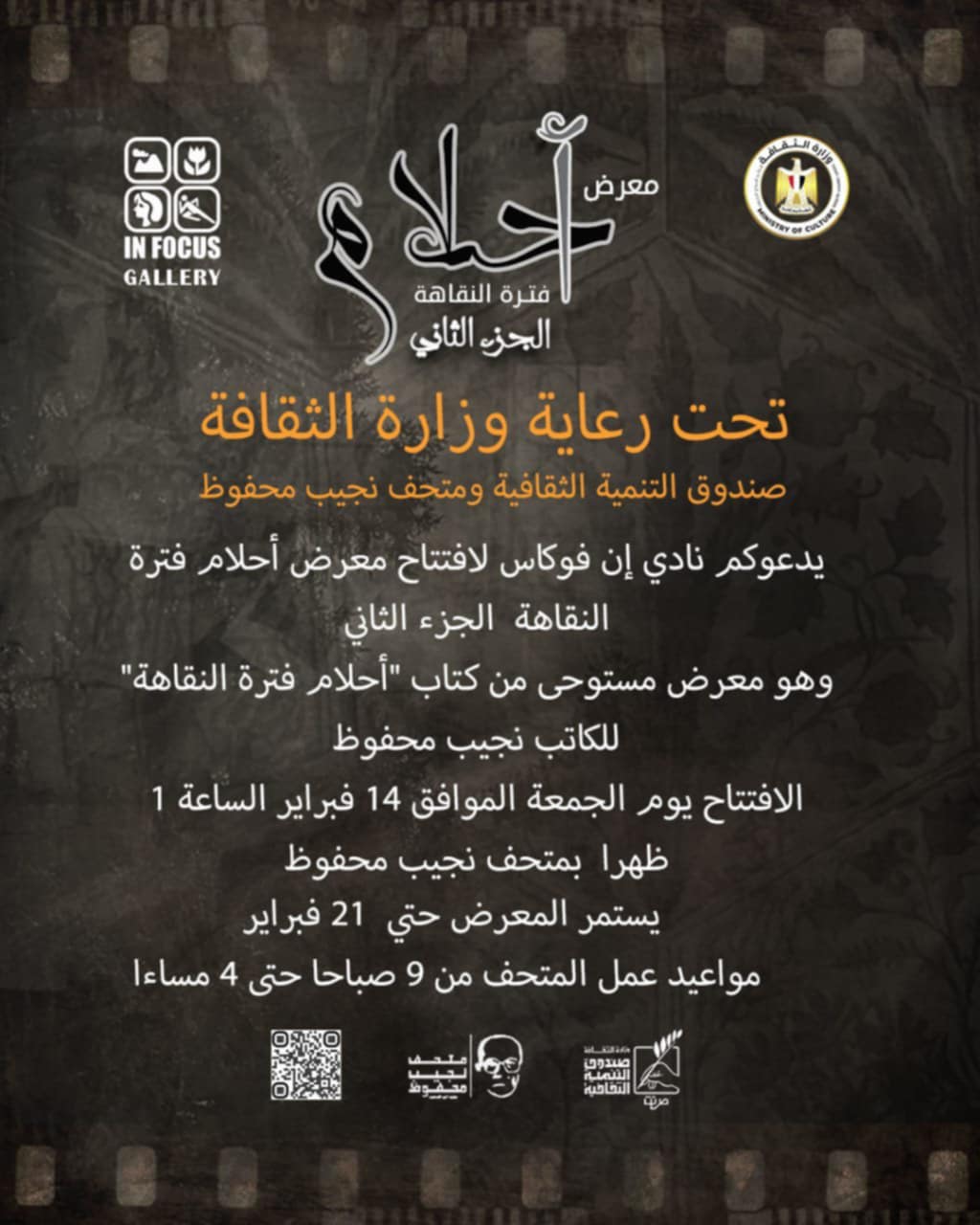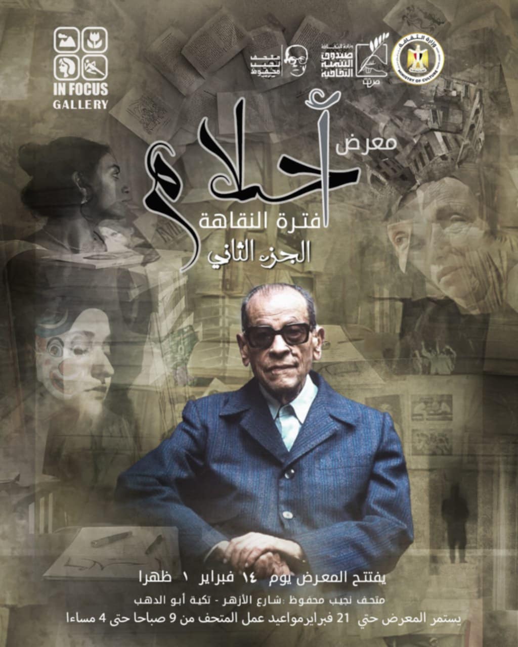 ينظم متحف ومركز إبداع نجيب محفوظ، التابع لصندوق التنمية الثقافية، برئاسة المعمارى حمدى السطوحى، فى الواحدة من ظهر يوم الجمعة القادم "١٤ فبراير"، معرضًا فوتوغرافيًا بعنوان "أحلام فترة النقاهة ٢"، المستوحى من رائعة "محفوظ" التى يحمل المعرض عنوانها.