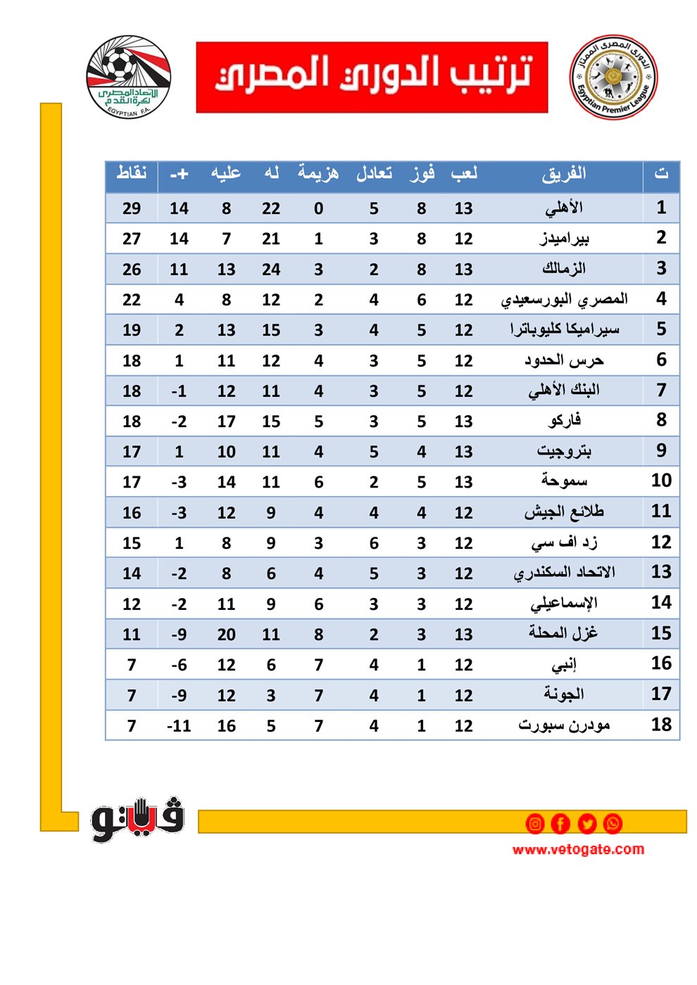 ترتيب الدوري المصري، تستكمل اليوم الأربعاء مباريات الجولة الـ 13 لمسابقة الدوري المصري بمواجهات زد ضد سيراميكا كليوباترا، الجونة ضد الإسماعيلي، بيراميدز ضد حرس الحدود، والمصري ضد البنك الأهلي.