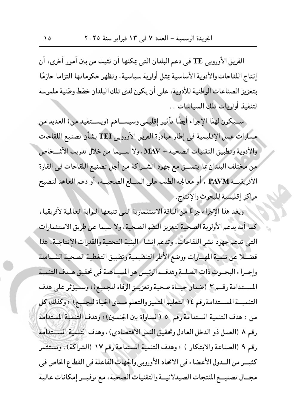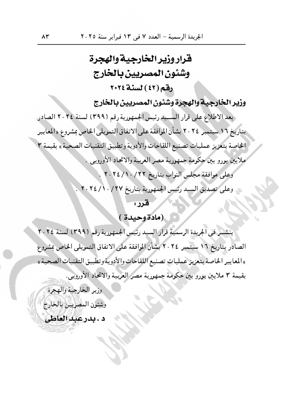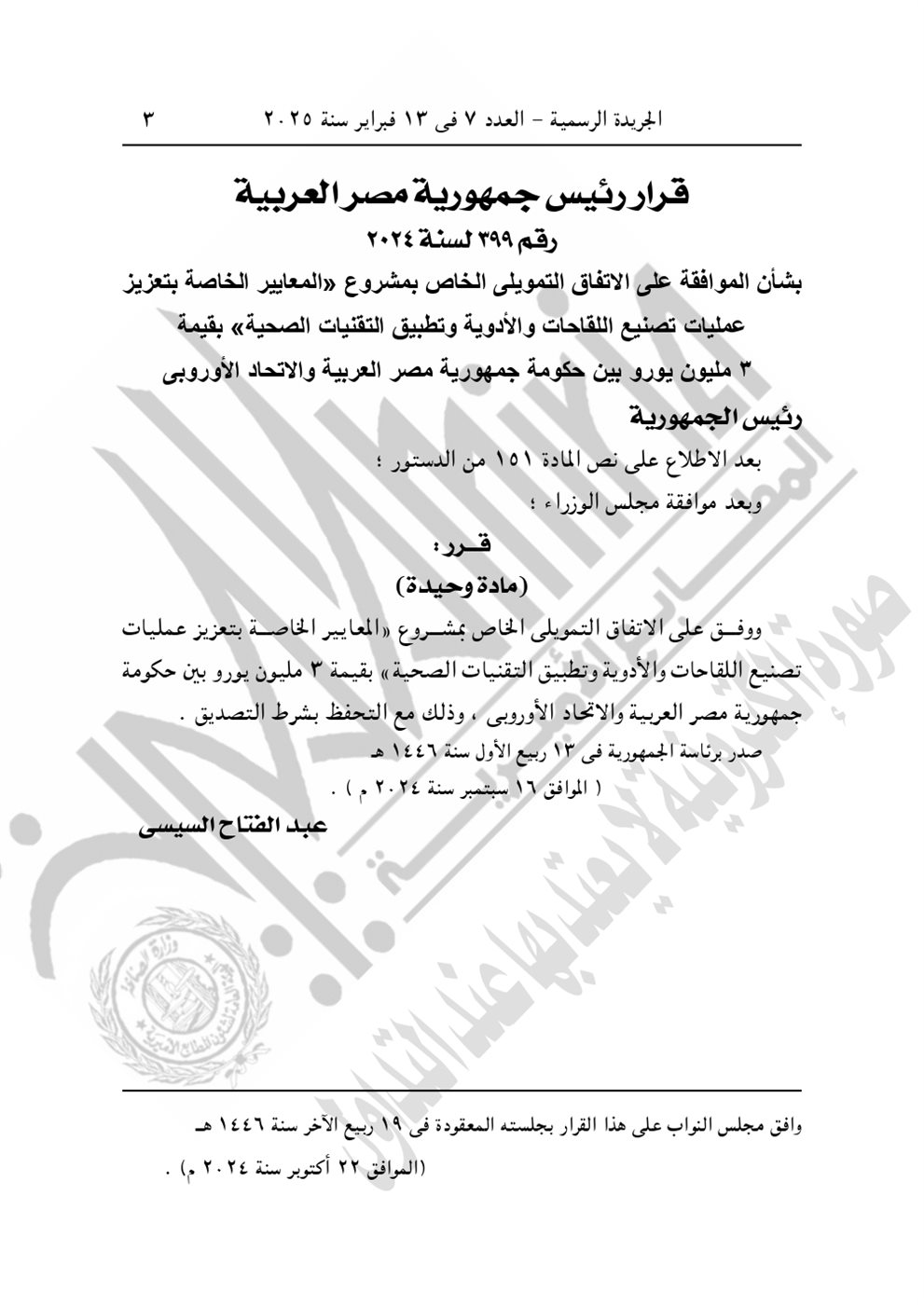 وجاء في نص القرار الجمهوري الجديد اليوم "الموافقة على الاتفاق التمويلى الخاص بمشروع "المعايير الخاصة بتعزيز عمليات تصنيع اللقاحات والأدوية وتطبيق التقنيات الصحية" بقيمة 3 مليون يورو بين حكومة جمهورية مصر العربية والاتحاد الأوروبى، وذلك مع التحفظ بشرط التصديق. صدر برئاسة الجمهورية فى 13 ربيع الأول سنة 1446 هـ، الموافق 16 سبتمبر سنة 2024".