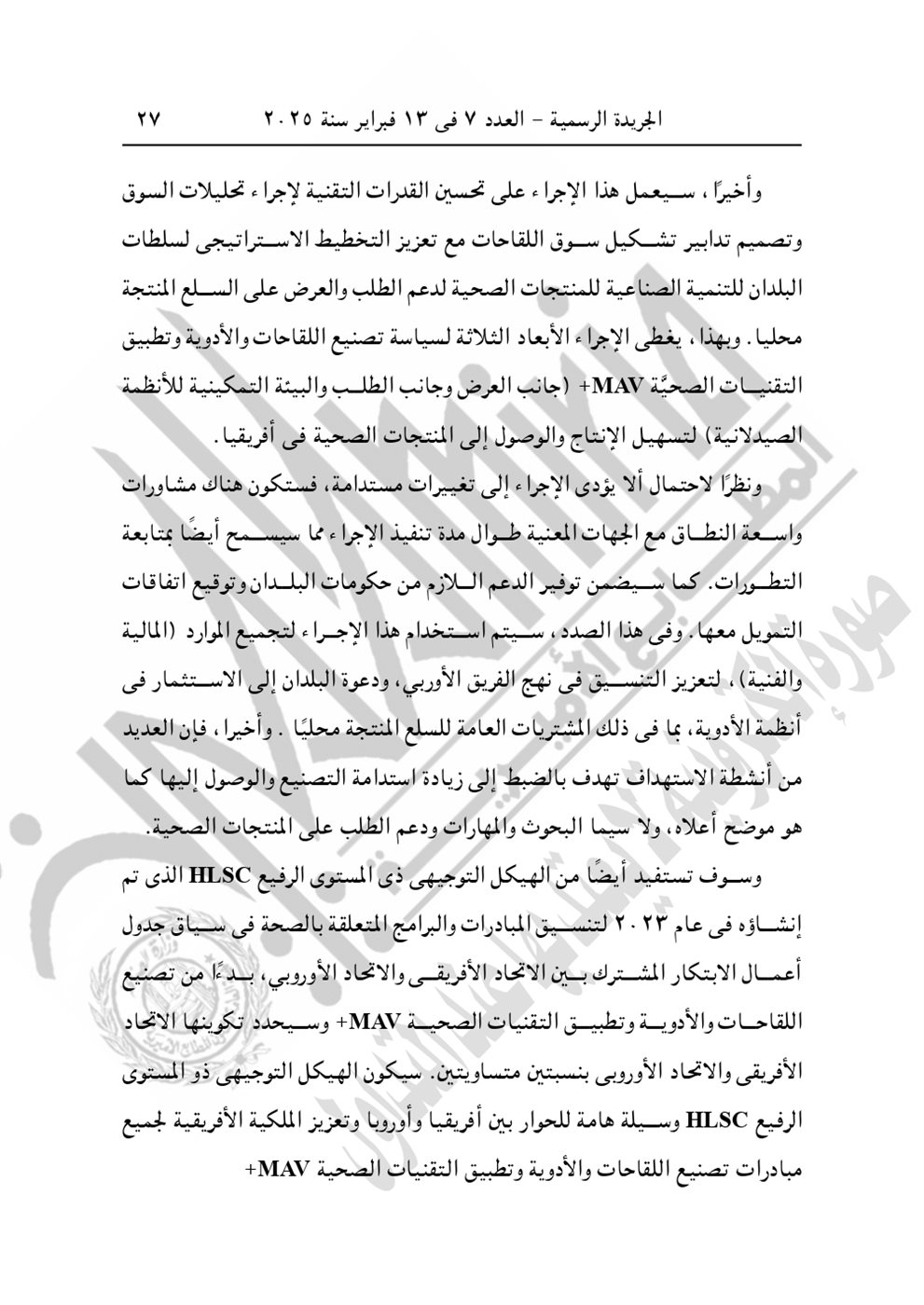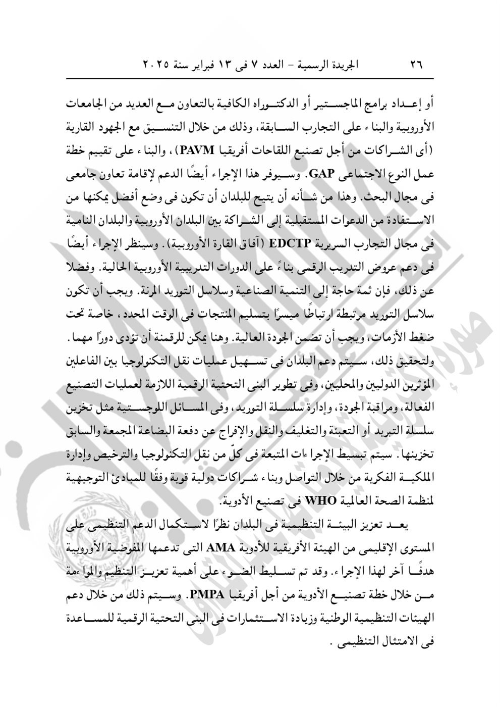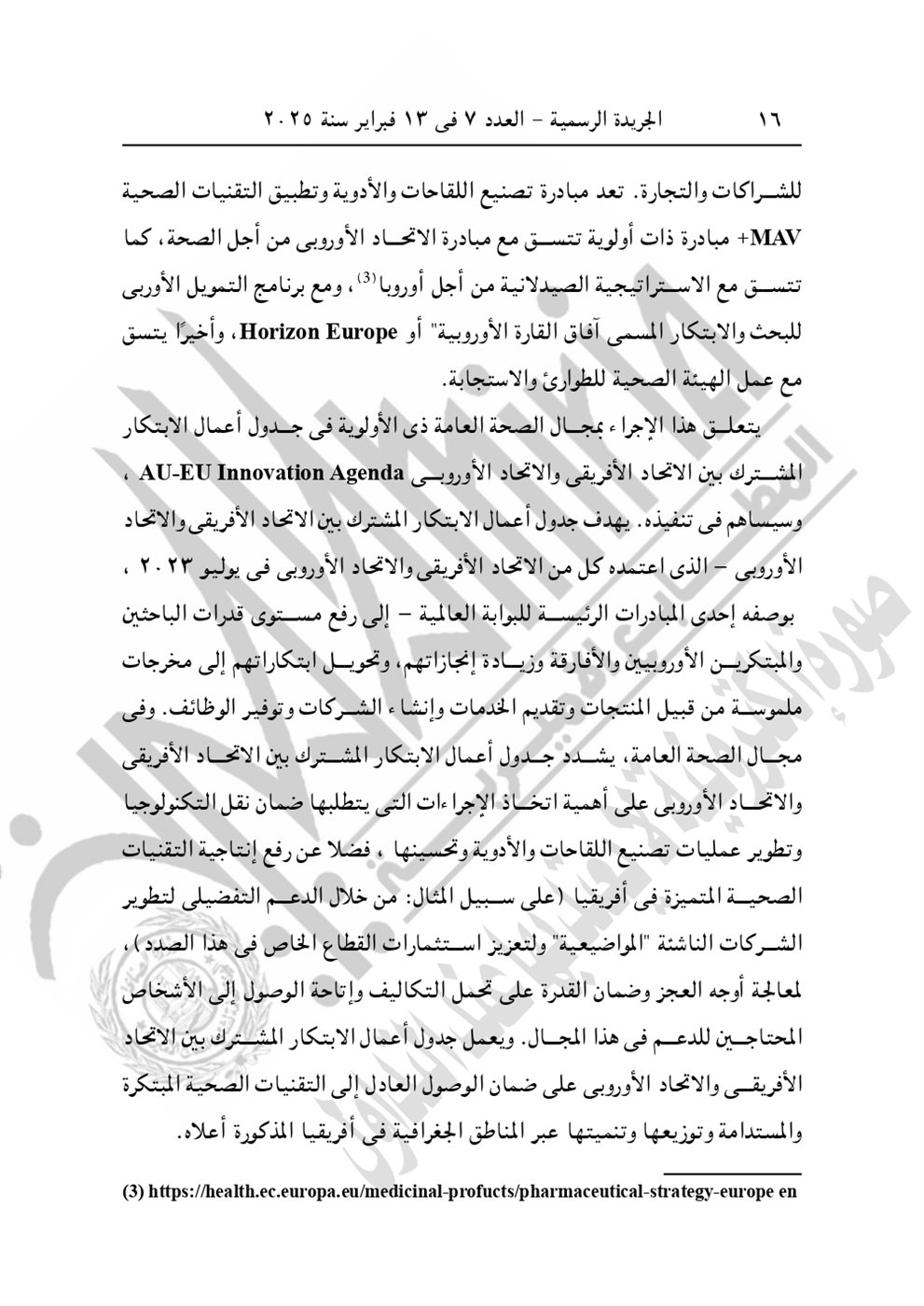وجاء في نص القرار الجمهوري الجديد اليوم "الموافقة على الاتفاق التمويلى الخاص بمشروع "المعايير الخاصة بتعزيز عمليات تصنيع اللقاحات والأدوية وتطبيق التقنيات الصحية" بقيمة 3 مليون يورو بين حكومة جمهورية مصر العربية والاتحاد الأوروبى، وذلك مع التحفظ بشرط التصديق. صدر برئاسة الجمهورية فى 13 ربيع الأول سنة 1446 هـ، الموافق 16 سبتمبر سنة 2024".