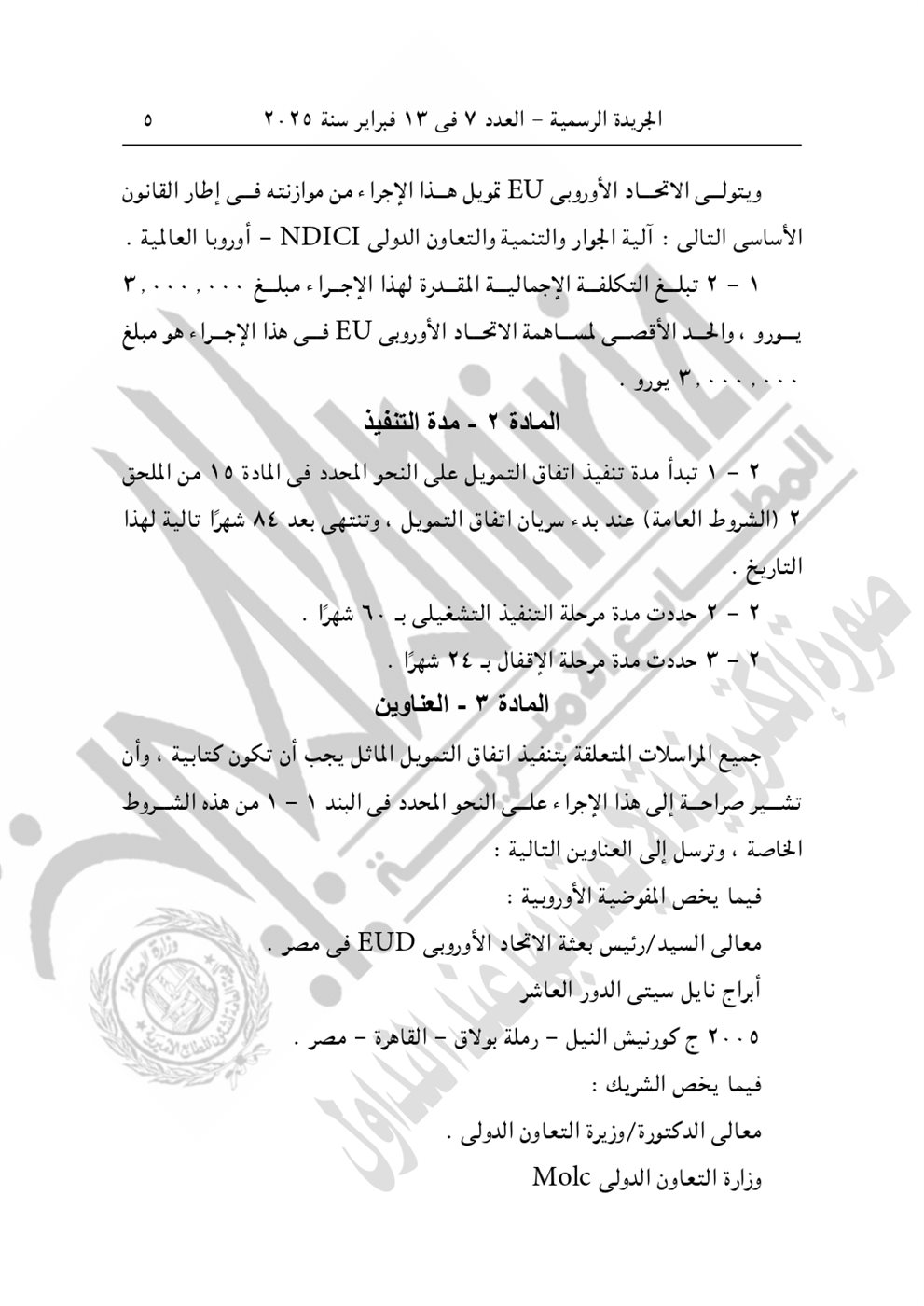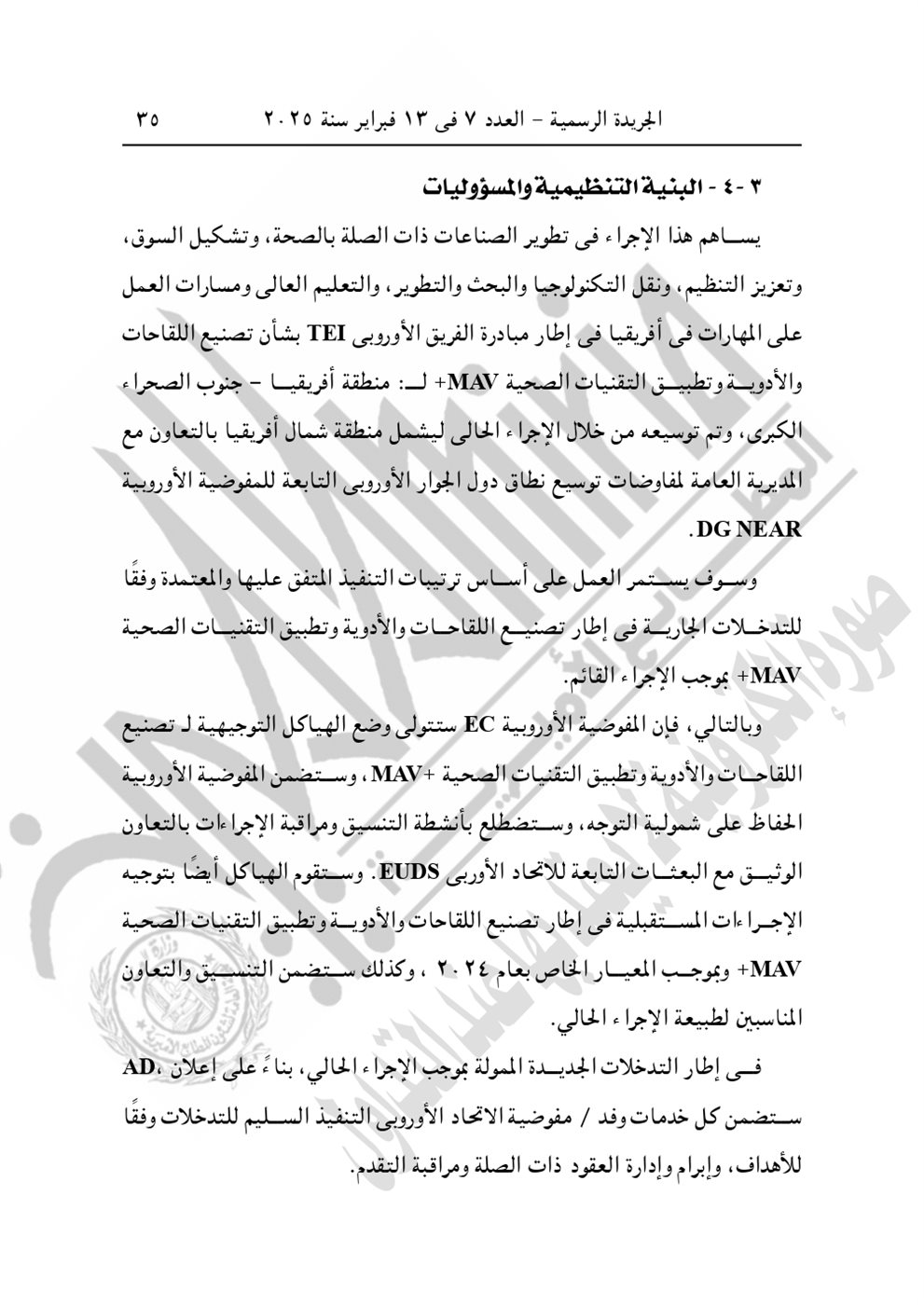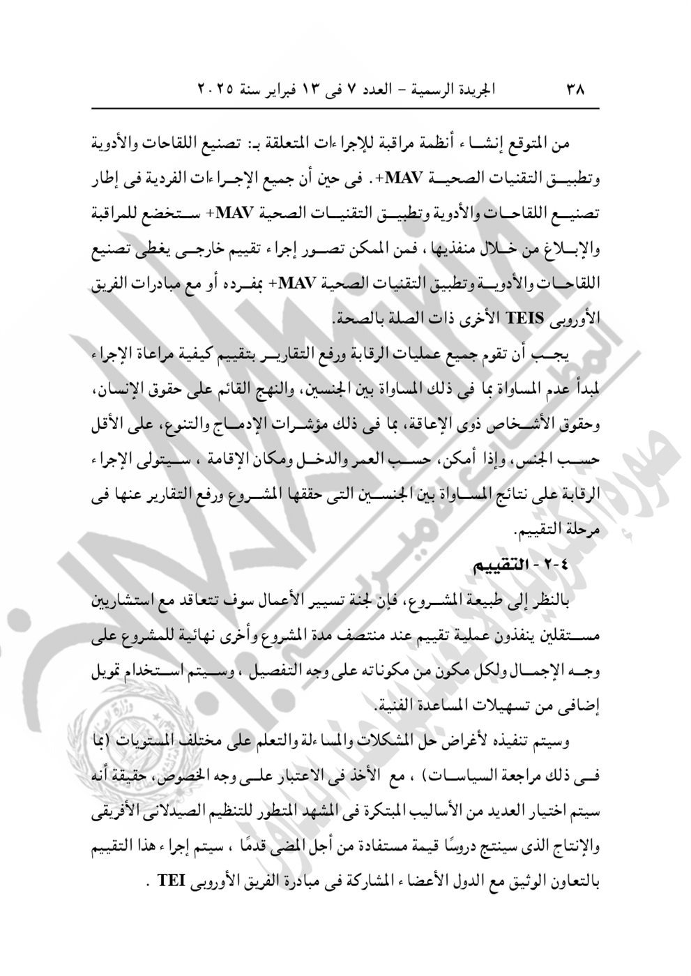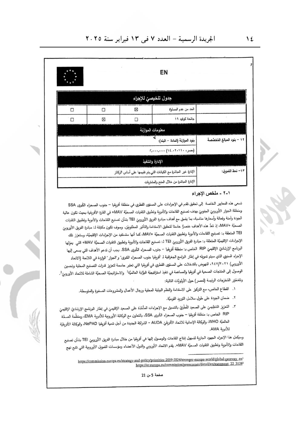 نشرت الجريدة الرسمية في عددها رقم 7، الصادر اليوم الخميس 13 فبراير 2025، القرار الجمهوري الجديد للرئيس عبد الفتاح السيسي رقم 399 لسنة 2024، بشأن الموافقة على الاتفاق التمويلى الخاص بمشروع "المعايير الخاصة بتعزيز عمليات تصنيع اللقاحات والأدوية وتطبيق التقنيات الصحية" بقيمة 3 مليون يورو بين الحكومة المصرية والاتحاد الأوروبي.