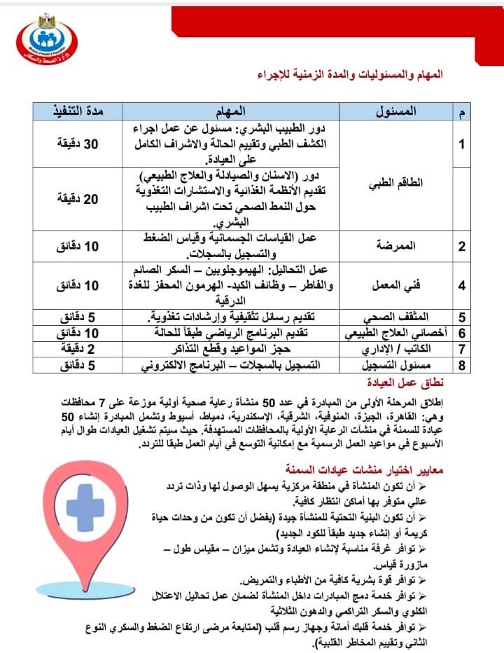 وتشمل المبادرة إنشاء 50 عيادة للسمنة في منشآت الرعاية الأولية بالمحافظات المستهدفة حيث سيتم تشغيل العيادات طوال أيام الأسبوع في مواعيد العمل الرسمية مع إمكانية التوسع في أيام العمل طبقا للتردد.