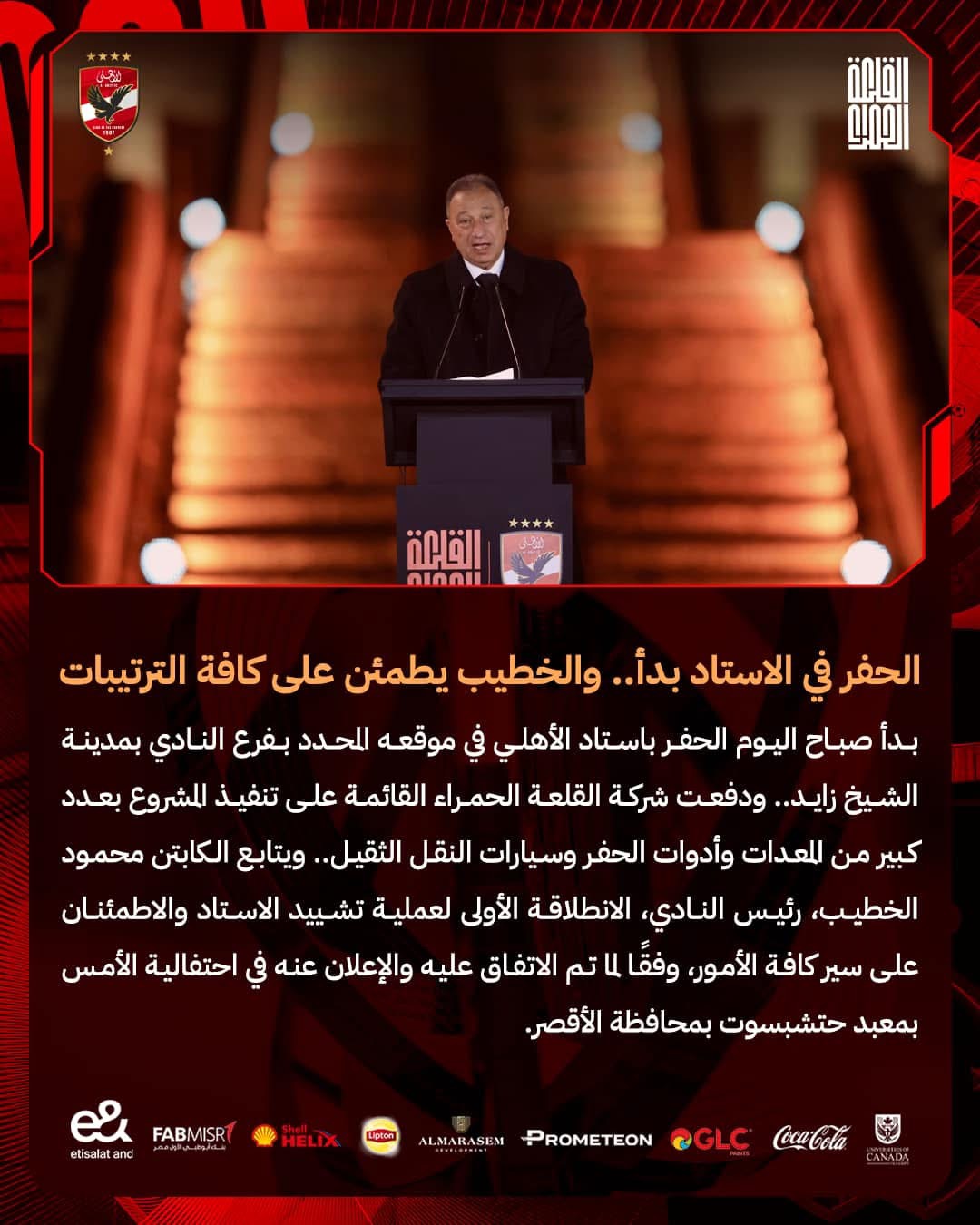 ويتابع محمود الخطيب، رئيس النادي الأهلي، الانطلاقة الأولى لعملية تشييد الاستاد والاطمئنان على سير كافة الأمور وفقًا لما تم الاتفاق عليه والإعلان عنه في احتفالية الأمس بمعبد حتشبسوت بمحافظة الأقصر.