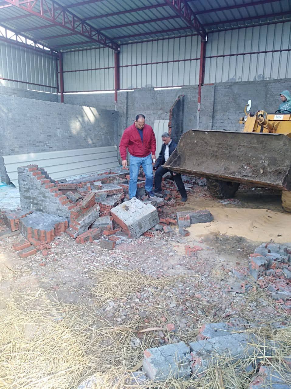 وقام فريق العمل بتنفيذ أعمال الإزالة الفورية لهنجر من الصاج والقوائم الحديدية وبداخلة غرفتين بدون ترخيص على مساحة 300م خارج الحيز العمراني بـ أرض زراعية.