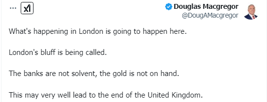 وعما يحدث في لندن وقد يؤدي إلى نهاية بريطانيا، قال الجنرال دوجلاس ماكجريجور، في تغريدة عبر منصة "أكس": "ما يحدث في لندن سيحدث هنا، تم استدعاء خدعة لندن، البنوك ليست قادرة على سداد ديونها، والذهب ليس متوفرا، وقد يؤدي هذا إلى نهاية المملكة المتحدة."
