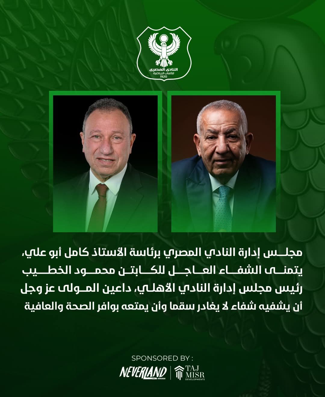 تمنى مجلس إدارة النادي المصري الشفاء لمحمود الخطيب رئيس النادي الأهلي بعد كشفه عن معاناته من أحد الأمراض التي قد تبعده عن القلعه الحمراء خلال الفترة المقبلة.