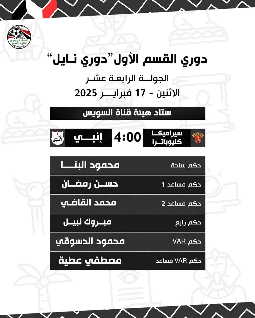 الدوري المصري، أعلنت لجنة الحكام الرئيسية بالاتحاد المصري لكرة القدم، أسماء حكام مباريات اليوم الإثنين، ضمن منافسات الدوري المصري الممتاز.. وجاءت على النحو التالي: