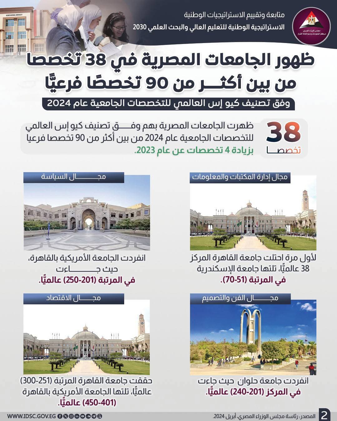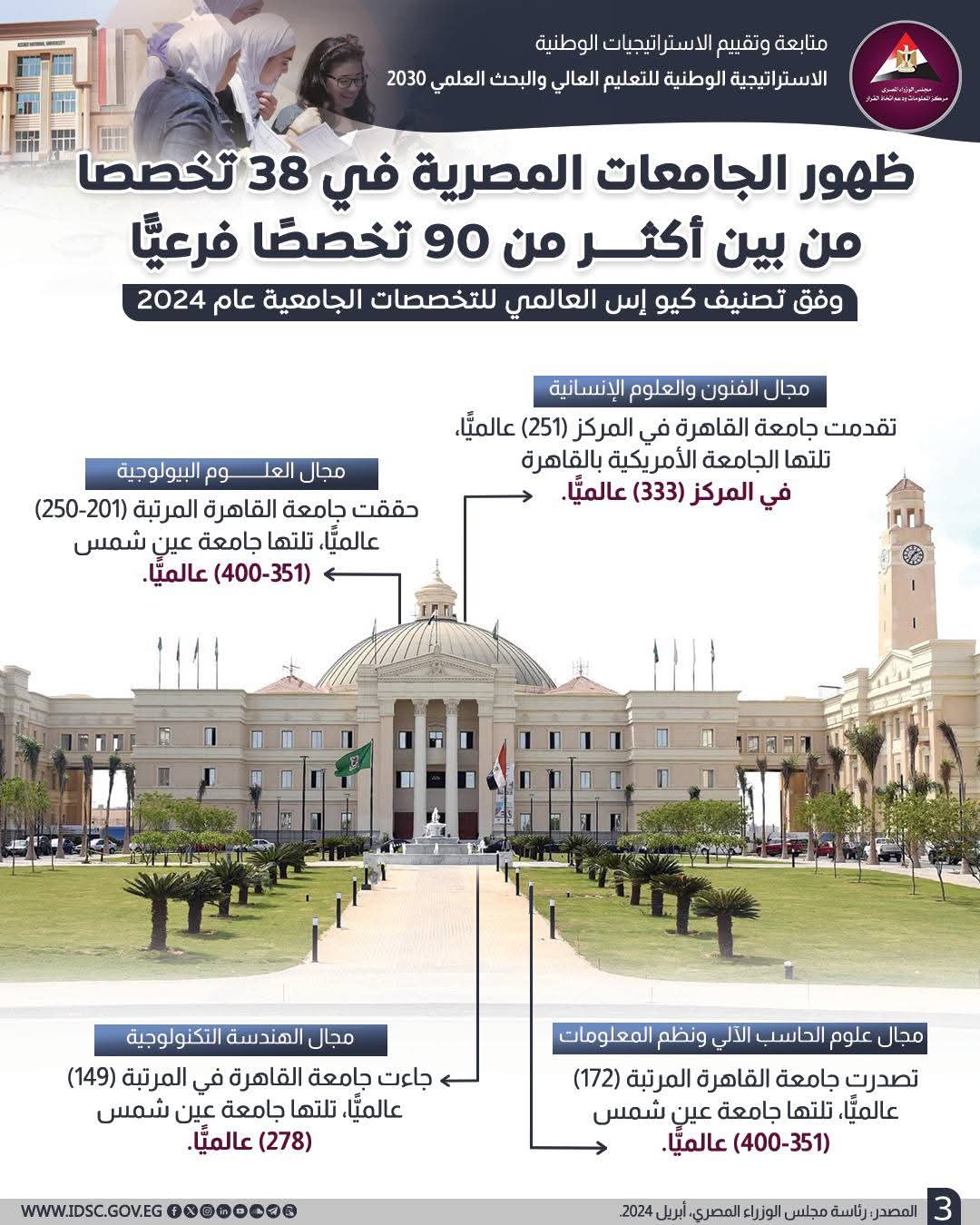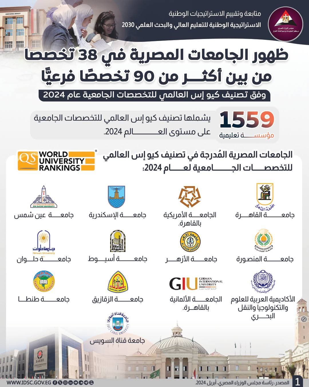نشرت الصفحة الرسمية لمركز المعلومات ودعم اتخاذ القرار بمجلس الوزراء إنفوجرافًا بعنوان "ظهور الجامعات المصرية في 38 تخصصًا من بين أكثر من 90 تخصصًا فرعيًا وفق تصنيف كيو إس العالمي للتخصصات الجامعية عام 2024"، والذي يبرز تقدم الجامعات المصرية في التصنيفات العالمية.