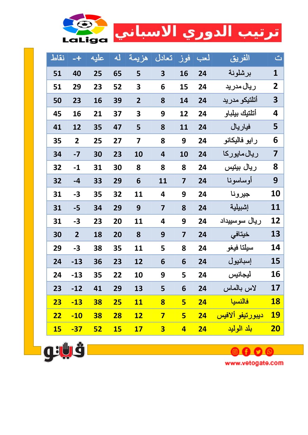 ترتيب الدوري الاسباني بعد الجولة الـ 24
