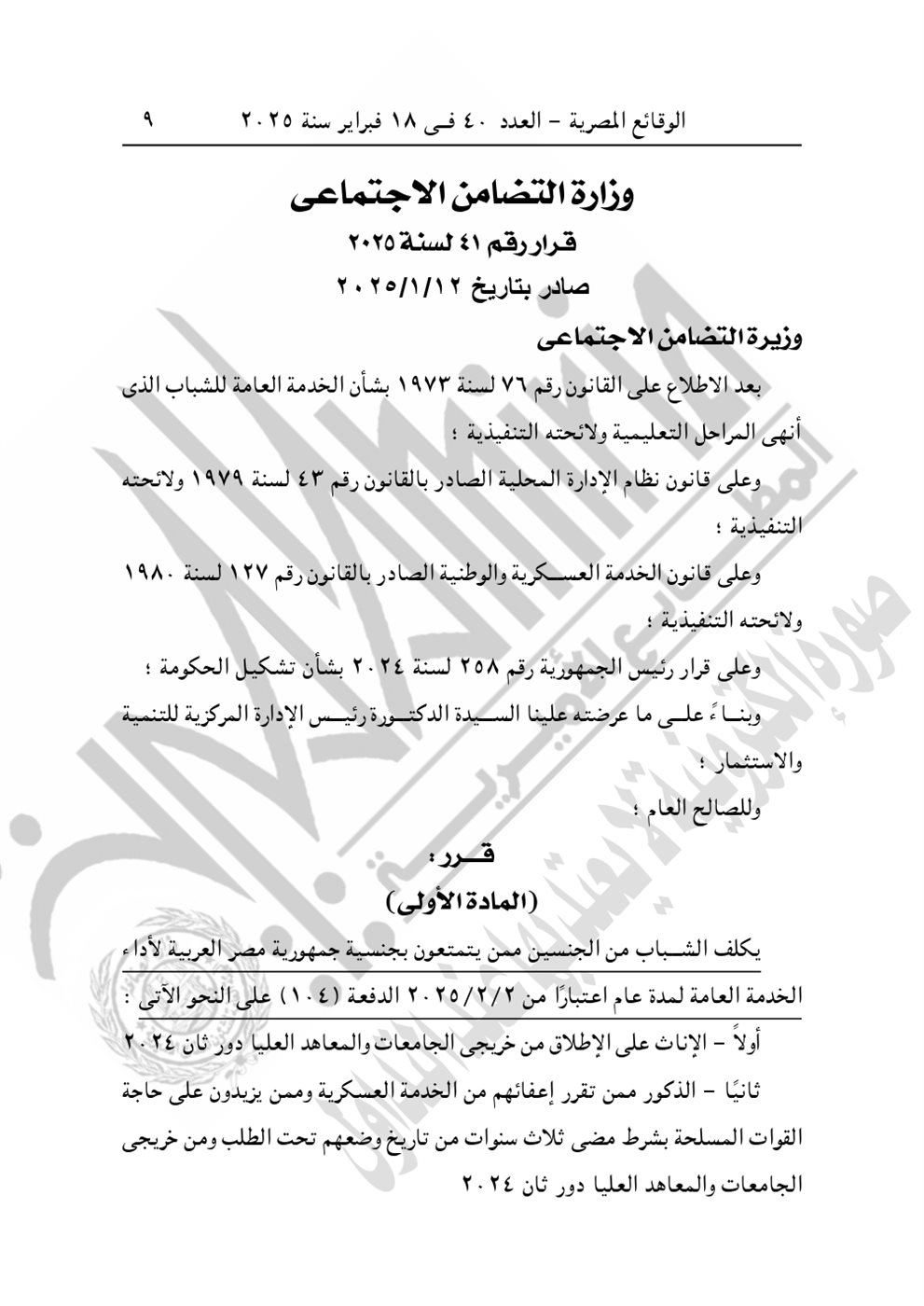 -وقرار وزارة التضامن الاجتماعي رقم 41 لسنة 2025، بتكليف الشباب من الجنسين، ممن يتمتعون بجنسية جمهورية مصر العربية لأداء الخدمة العامة لمدة عام، اعتبارا من 2/2/2025 الدفعة (104) على النحو الآتى: أولًا: الإناث على الإطلاق من خريجى الجامعات والمعاهد العليا دور ثان 2024.