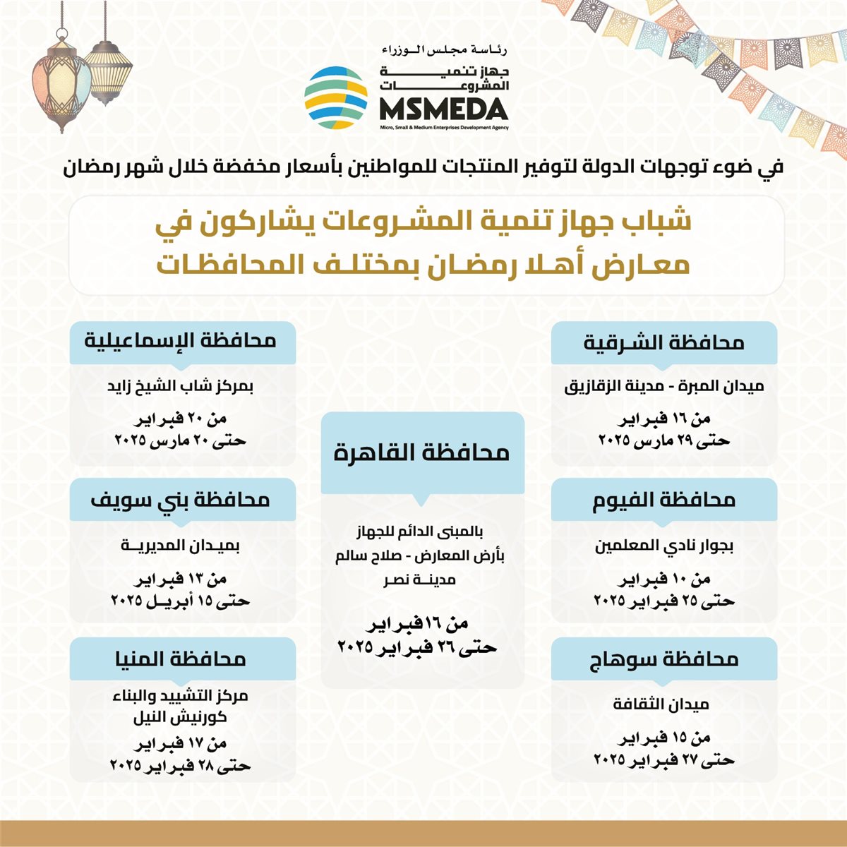 جدير بالذكر أنه تقرر إقامة معرض الشرقية بميدان المبرة بمدينة الزقازيق خلال الفترة من 16 فبراير حتى نهاية شهر رمضان، بينما تقرر إقامة معرض الإسماعيلية بمركز شباب الشيخ زايد خلال الفترة من 20 فبراير وحتى 20 مارس.