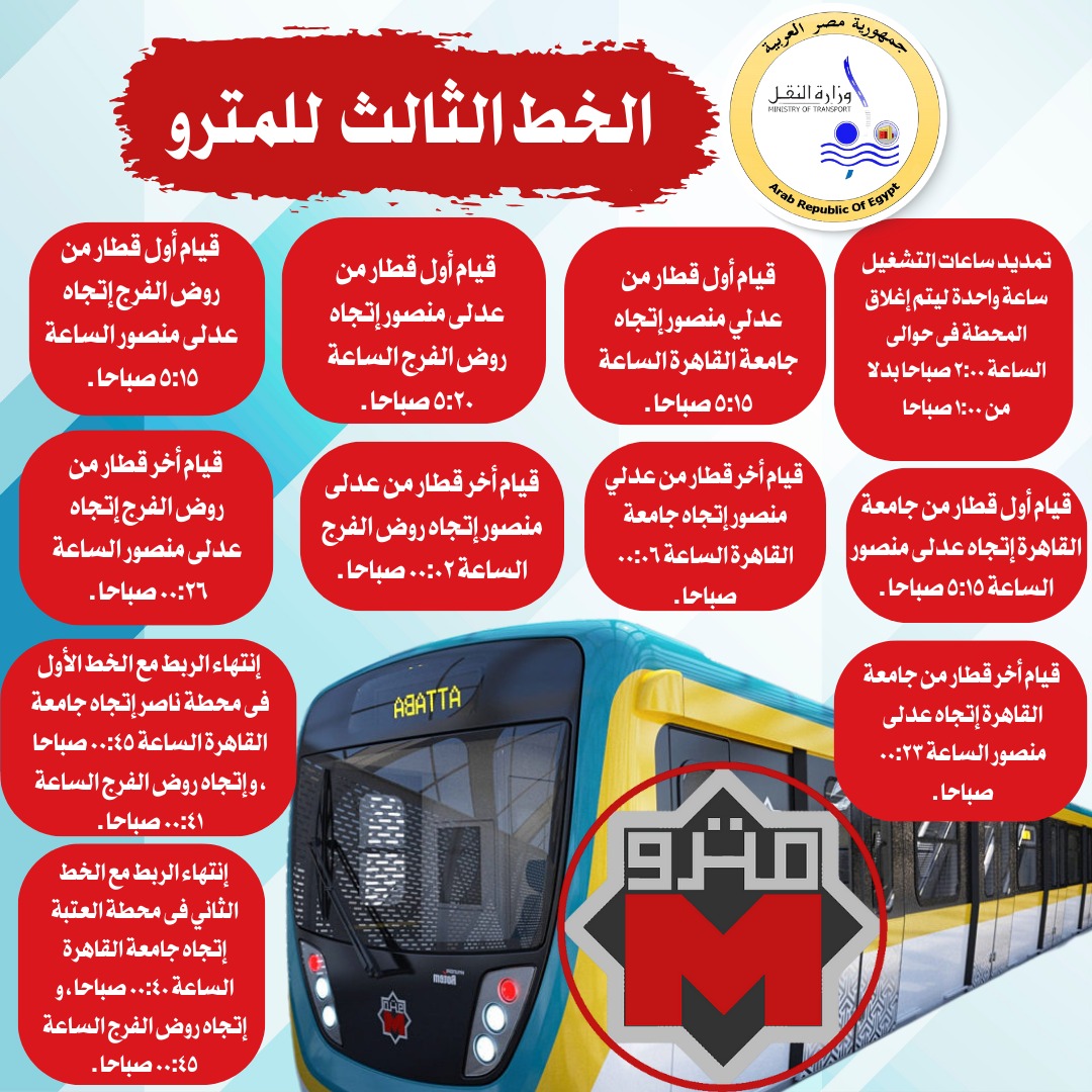 نشرت وزارة النقل تقرير مصحوب بإنفوجراف لمواعيد تشغيل مترو الخط الثالث خلال شهر رمضان المبارك والتي جاءت كما يلي: