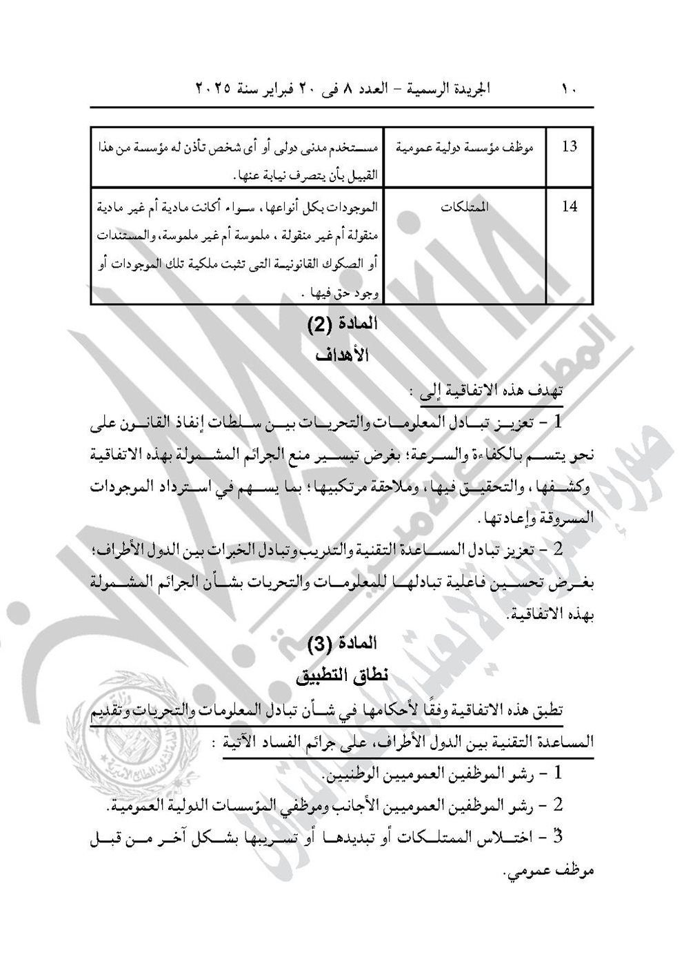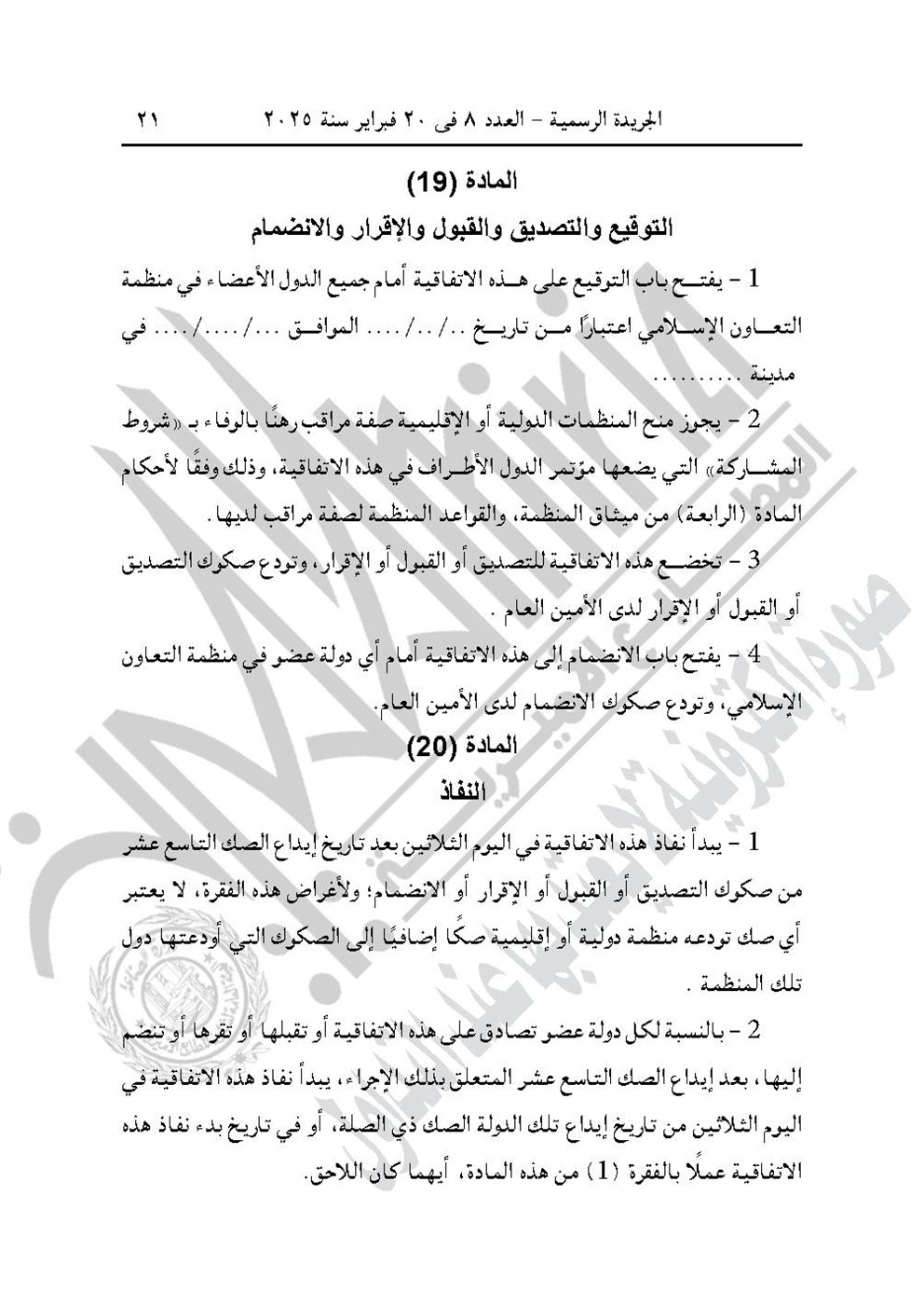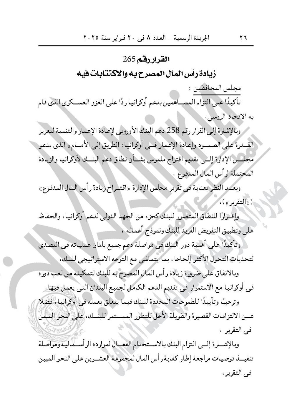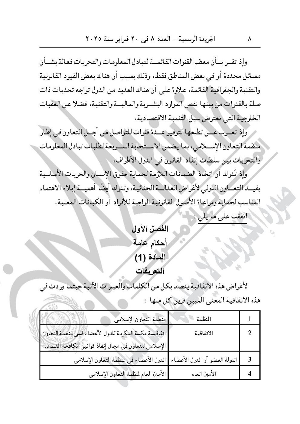 نشرت الجريدة الرسمية في عددها رقم 8 الصادر اليوم الخميس 20 فبراير 2025، قرارين جمهوريين جديدين للرئيس عبد الفتاح السيسي، بشأن الموافقة على انضمام جمهورية مصر العربية لاتفاقية مكة المكرمة لمكافحة الفساد، واكتتاب مصر بعدد (414) سهمًا في زيادة رأس مال البنك الأوروبي لإعادة الإعمار والتنمية.