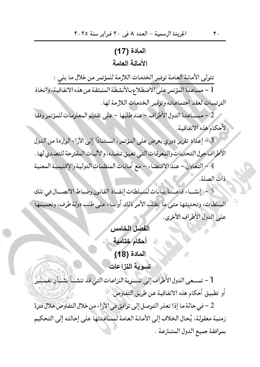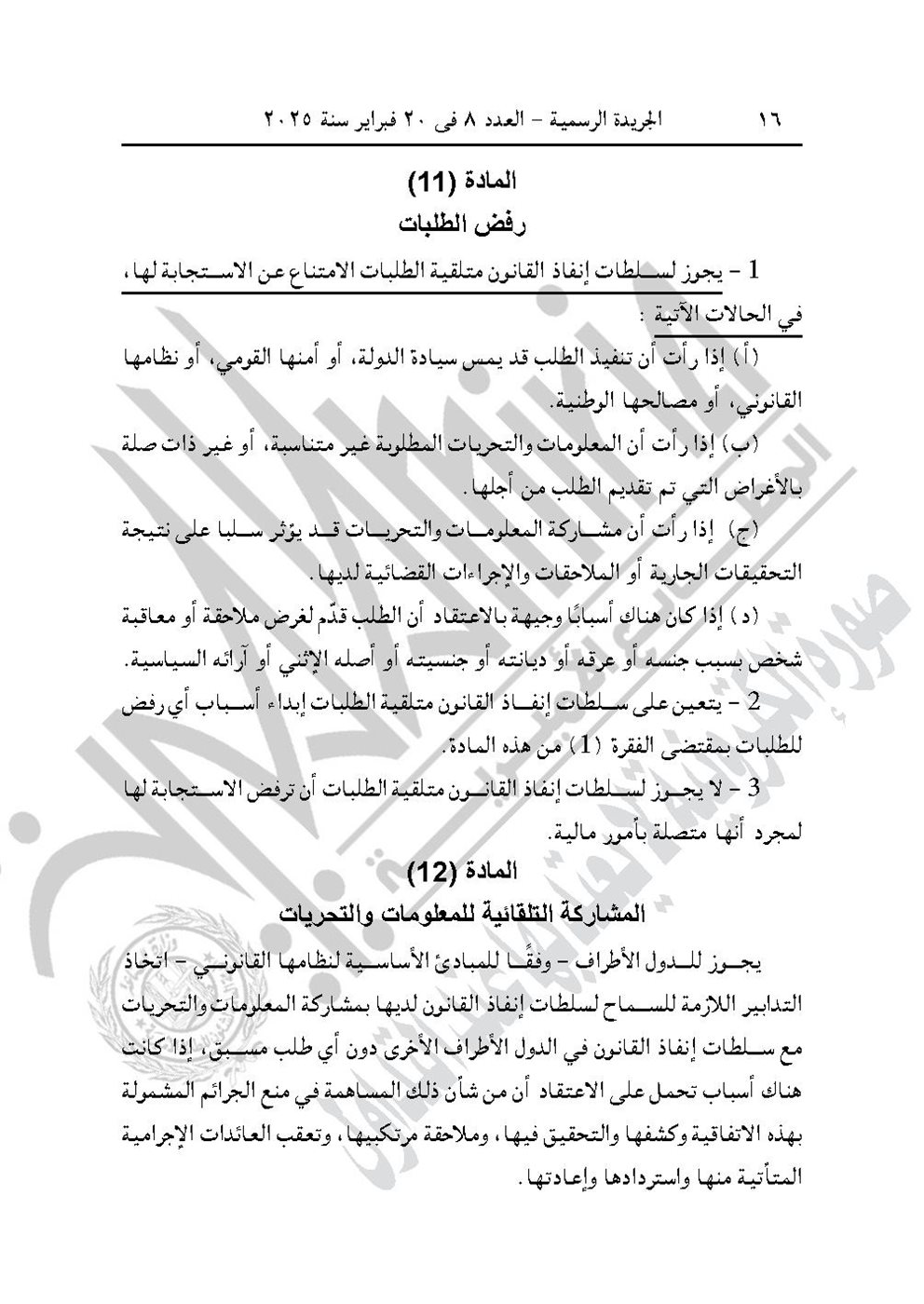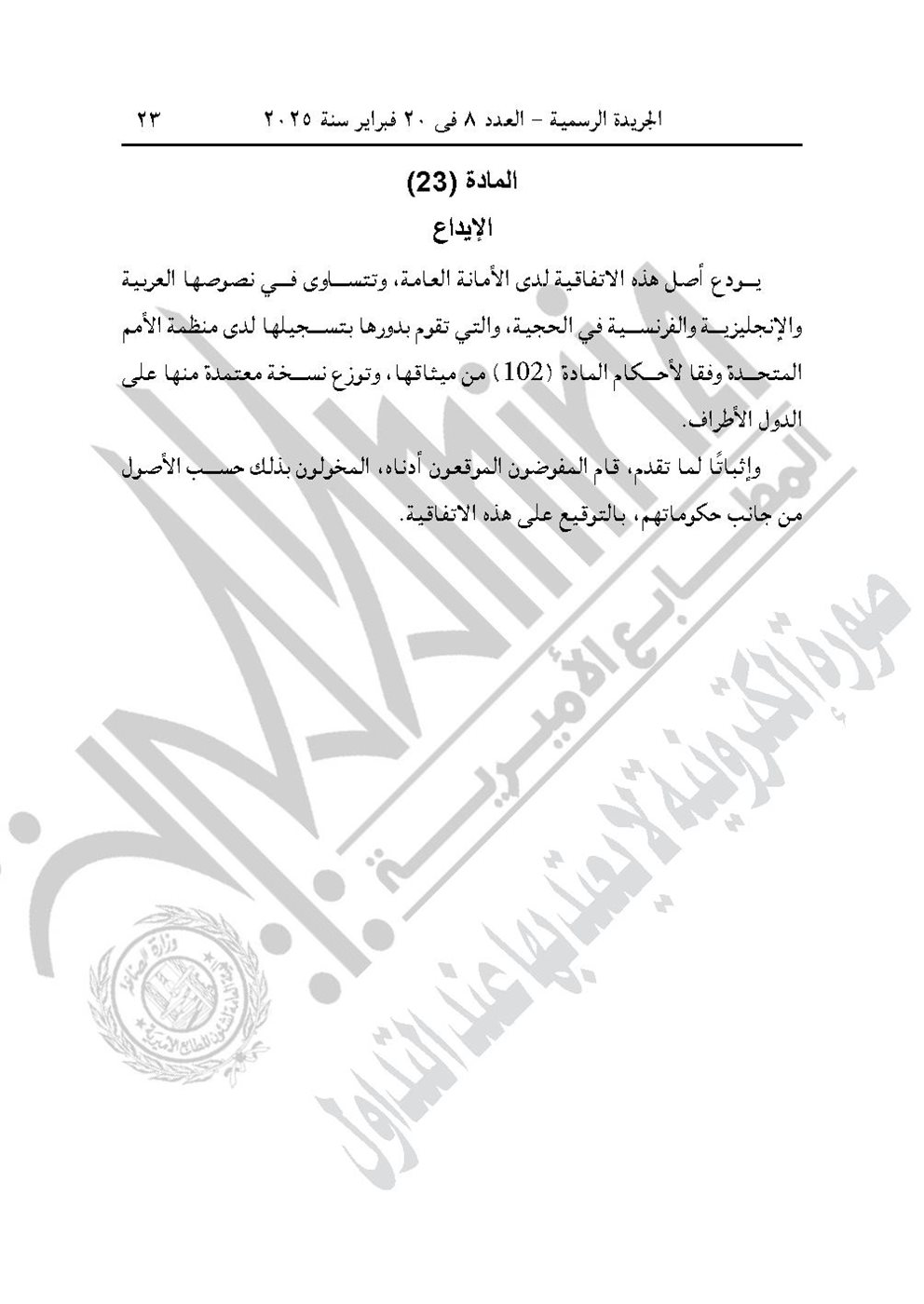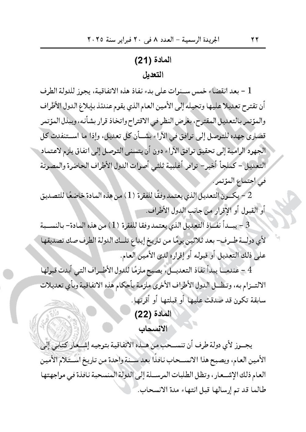 نشرت الجريدة الرسمية في عددها رقم 8 الصادر اليوم الخميس 20 فبراير 2025، قرارين جمهوريين جديدين للرئيس عبد الفتاح السيسي، بشأن الموافقة على انضمام جمهورية مصر العربية لاتفاقية مكة المكرمة لمكافحة الفساد، واكتتاب مصر بعدد (414) سهمًا في زيادة رأس مال البنك الأوروبي لإعادة الإعمار والتنمية.