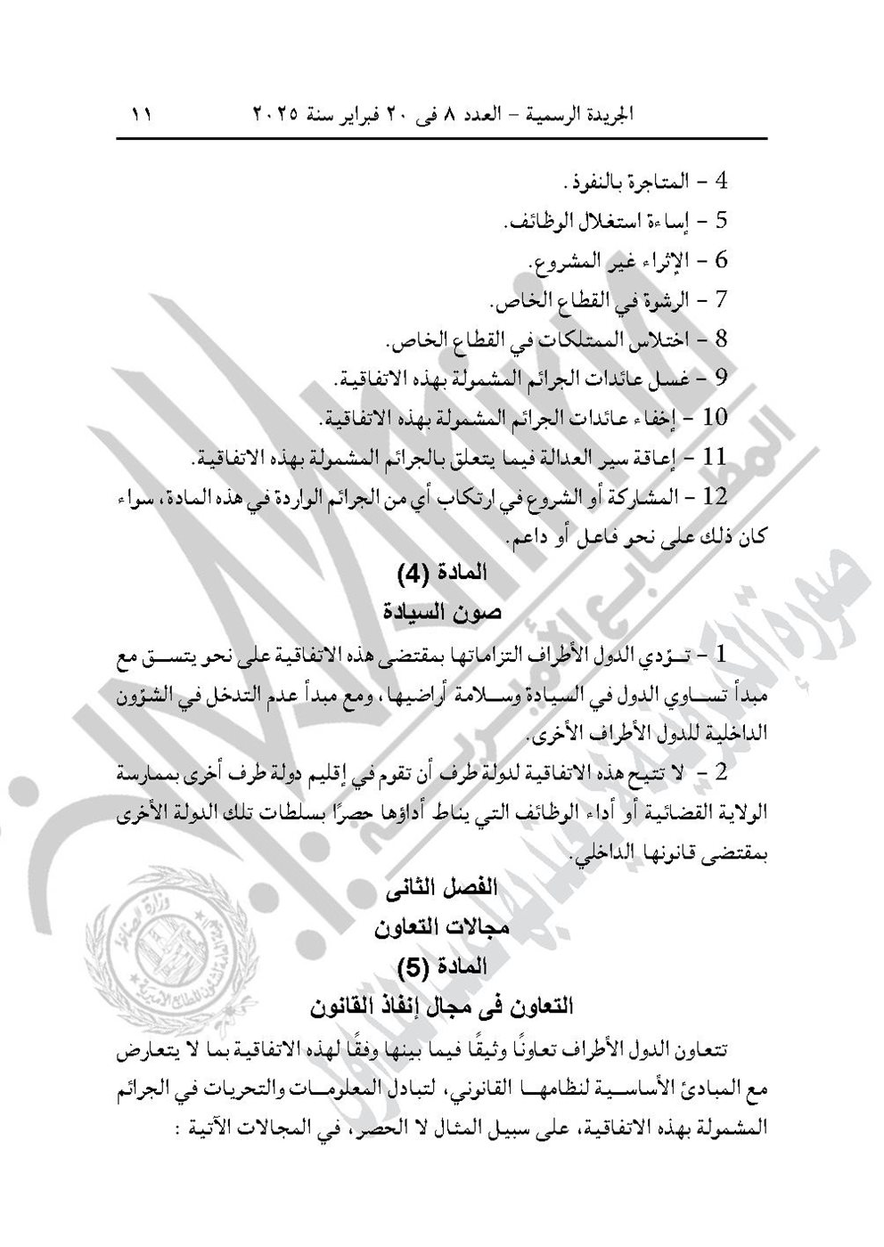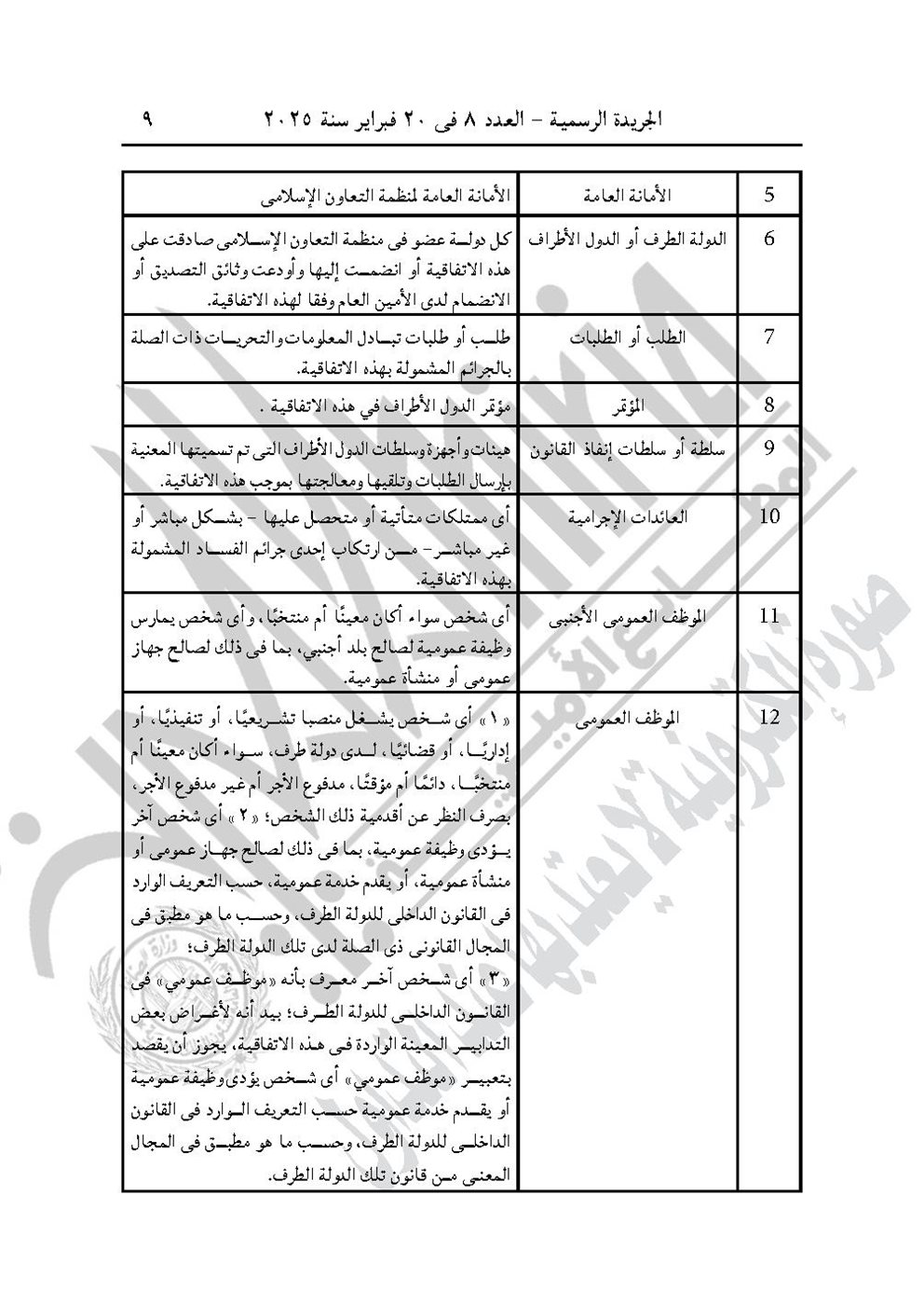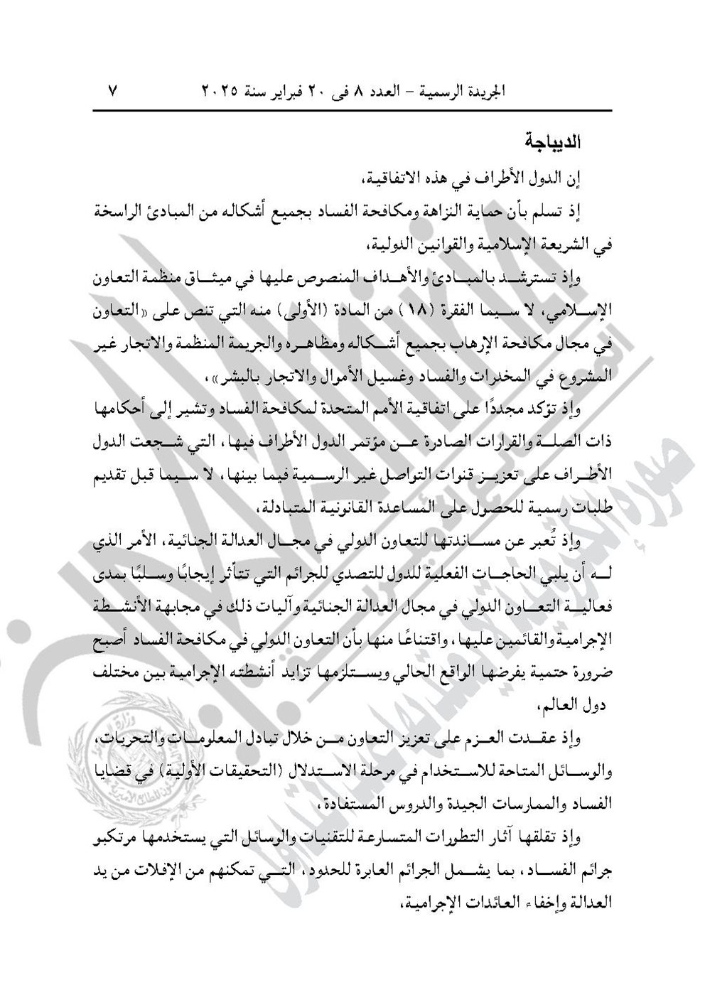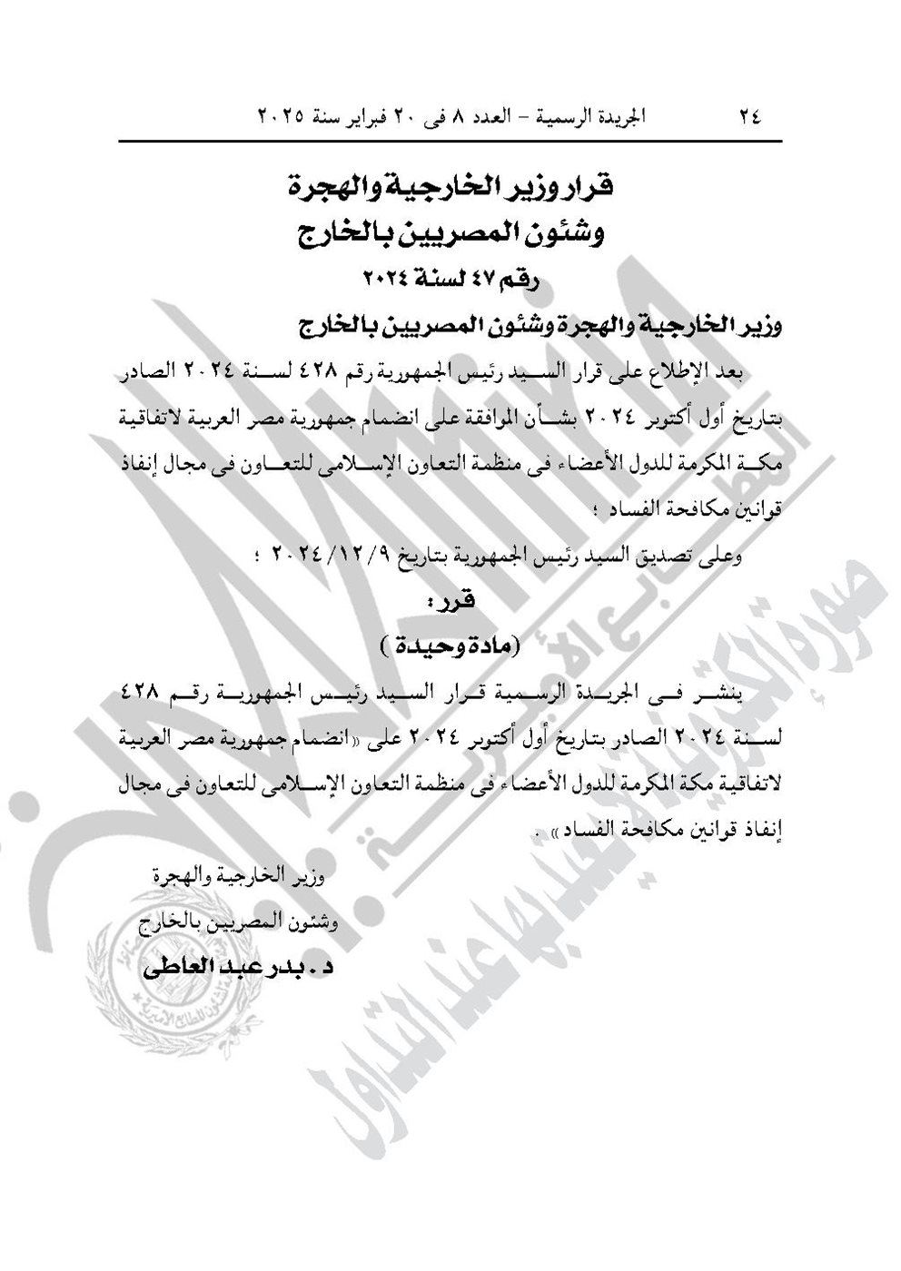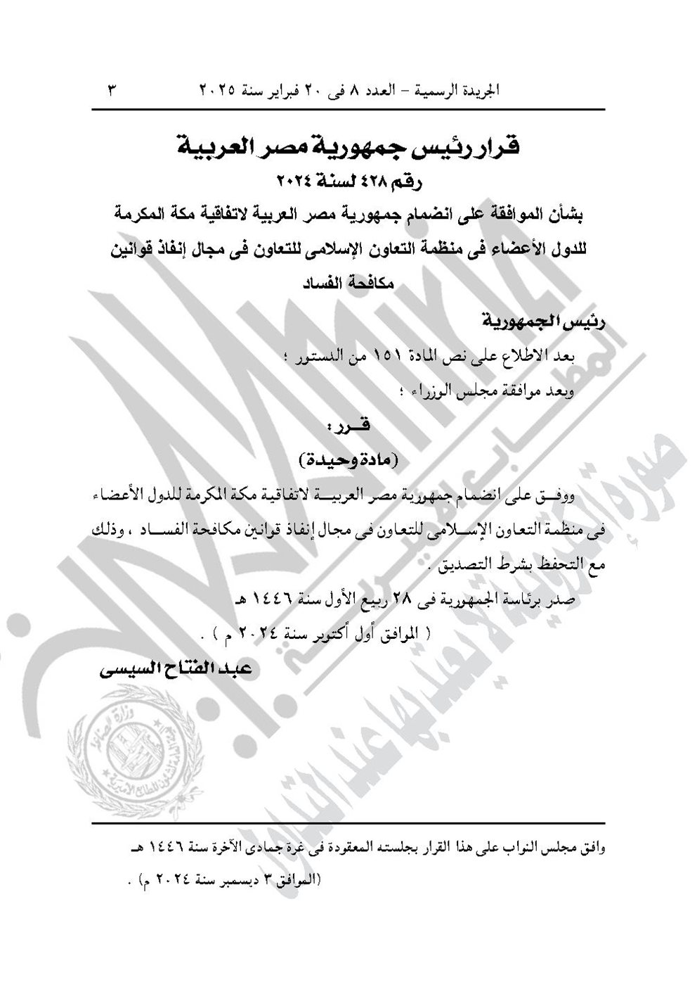 -القرار الجمهوري الجديد رقم 428 لسنة 2024، بشأن الموافقة على انضمام جمهورية مصر العربية لاتفاقية مكة المكرمة للدول الأعضاء في منظمة التعاون الإسلامي للتعاون في مجال إنفاذ قوانين مكافحة الفساد.