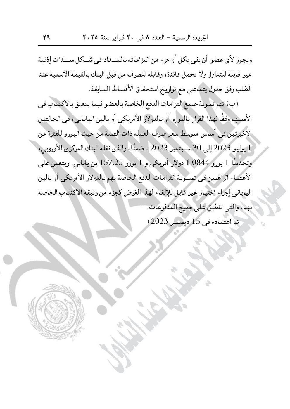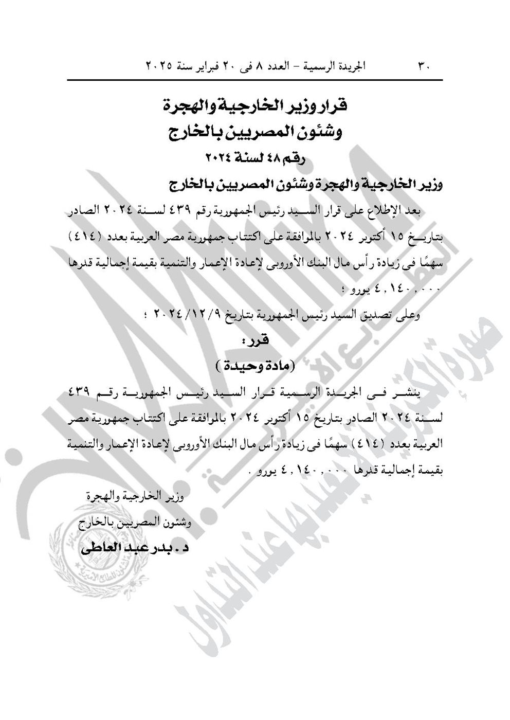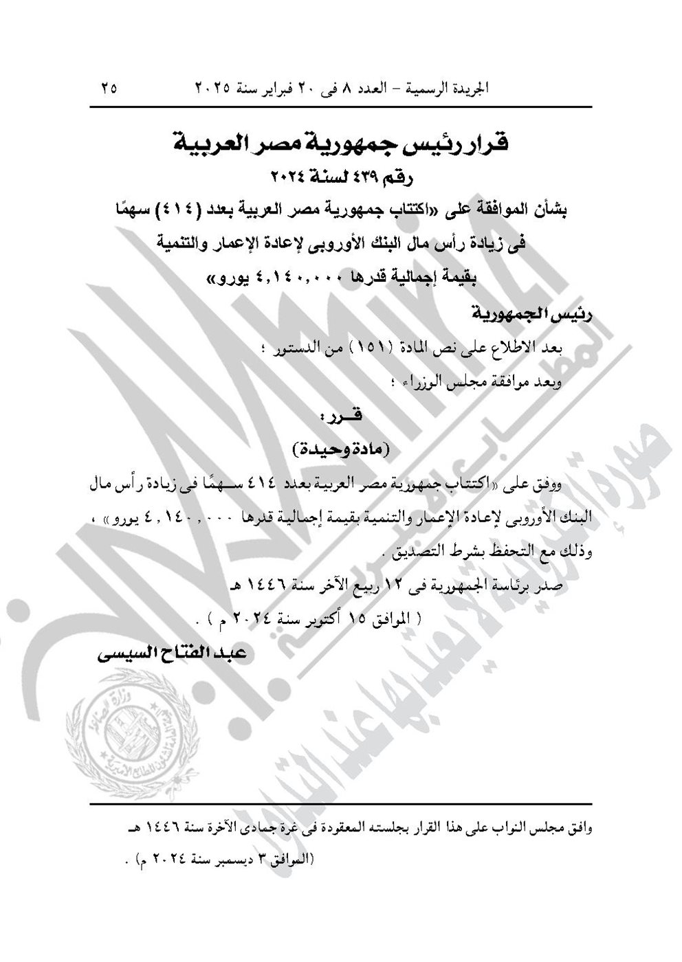 -والقرار الجمهوري رقم 439 لسنة 2024، بشأن الموافقة على اكتتاب جمهورية مصر العربية بعدد (414) سهمًا في زيادة رأس مال البنك الأوروبي لإعادة الإعمار والتنمية بقيمة إجمالية قدرها 4,140,000 يورو.