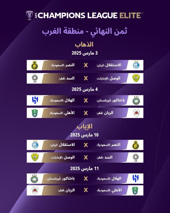 وسيلتقي فريق الهلال نظيره باختاكور الأوزبكي عند التاسعة مساء يوم الثلاثاء 4 مارس 2025 بستاد جار طاشكند ـ بالتوقيت المحلي لأصحاب الأرض، على أن يحل فريق الأهلي ضيفًا على نظيره الريان القطري على ملعب ستاد أحمد بن علي عند التاسعة من مساء اليوم ذاته، بالتوقيت المحلي لصاحب الأرض.