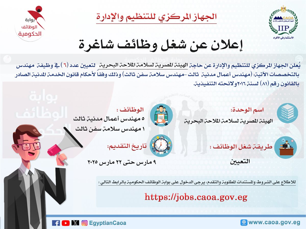 كما أعلن الجهاز المركزي للتنظيم والإدارةعن حاجة الهيئة المصرية لسلامة الملاحة البحرية التابعة لوزارة النقل لتعيين (5) في وظيفة مهندس أعمال مدنية ثالث، وعدد (1) في وظيفة مهندس سلامة سفن ثالث، وذلك وفقًا لأحكام قانون الخدمة المدنية الصادر بالقانون رقم (81) لسنة 2016 ولائحته التنفيذية.