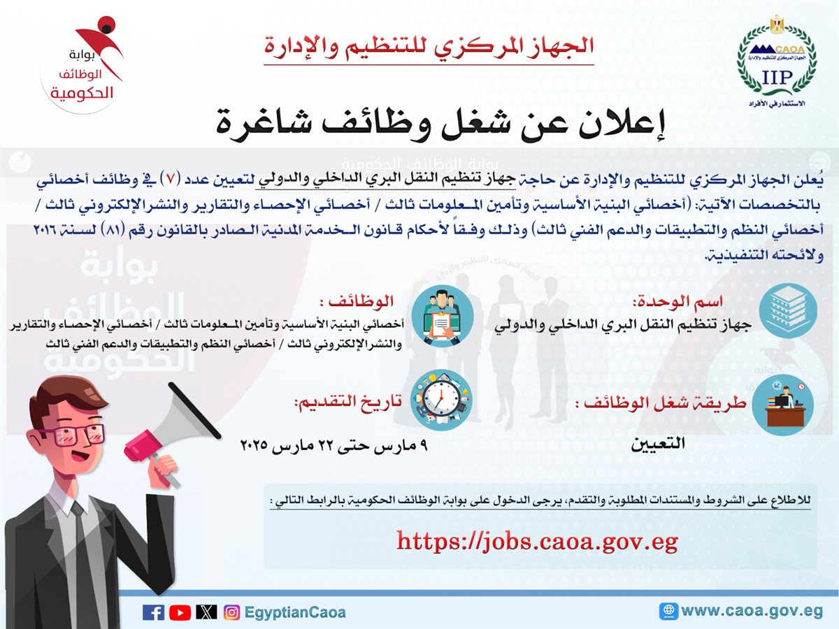 وعن الشروط المطلوبة للتقديم لوظائف جهاز تنظيم النقل البري الداخلي والدولي، تضمنت شروط التقديم لتلك الوظائف ما يلي: