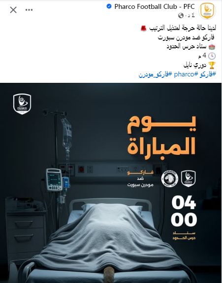ونشرت صفحة فاركو على فيسبوك منشورًا قبل مباراة مودرن سبورت المقرر لها اليوم الجمعة في الجولة الـ 15 لبطولة الدوري الممتاز بالإشارة إلى فريق مودرن بوضعه على سرير المرضي بالمستشفي معلقين “لدينا حالة حرجة لمتذيل الترتيب” بأسلوب ساخر.