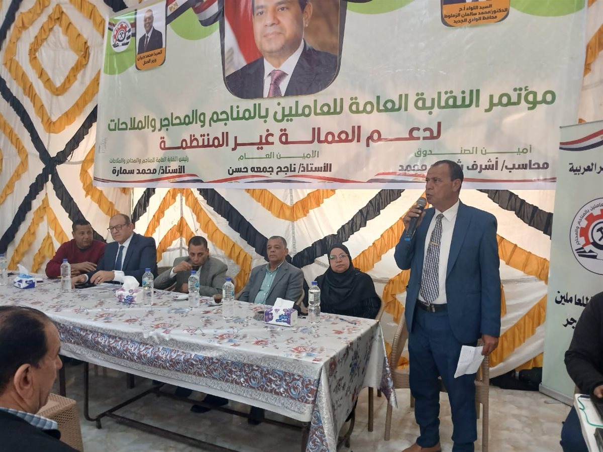 نظّمت النقابة العامة للعاملين بالمناجم والمحاجر والملاحات مؤتمرًا موسعًا بمحافظة الوادي الجديد، برعاية محمد جبران، وزير العمل، واللواء دكتور محمد سالمان الزملوط، محافظ الوادي الجديد، ومشاركة أعضاء المجلس التنفيذي للنقابة العامة المناجم والمحاجر بقيادة محمد سماره رئيسها والأمين العام ناجح جمعه، وأشرف شحاته أمين الصندوق وأمينها العام.