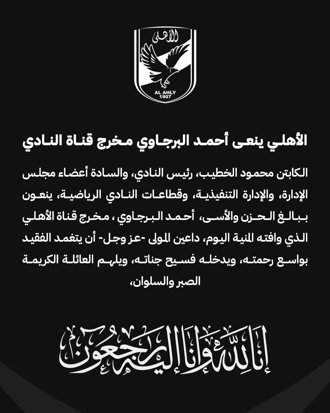 نعي محمود الخطيب رئيس النادي الأهلي وأعضاء محلي الإدارة والإدارة التنفيذية وقطاعات النادي الرياضي، أحمد البرجاوي مخرج قناة الأهلي الذي وافته المنية اليوم.