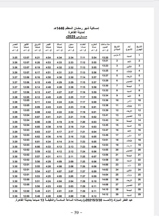 وتكون متوسط عدد ساعات الصيام خلال الشهر الكريم 14 ساعة، وفيما يلى إمساكية شهر رمضان الكريم.