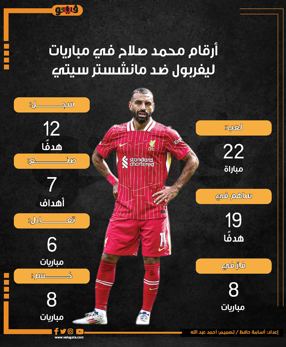 أرقام محمد صلاح في مباريات ليفربول ضد مانشستر سيتي (إنفوجراف)