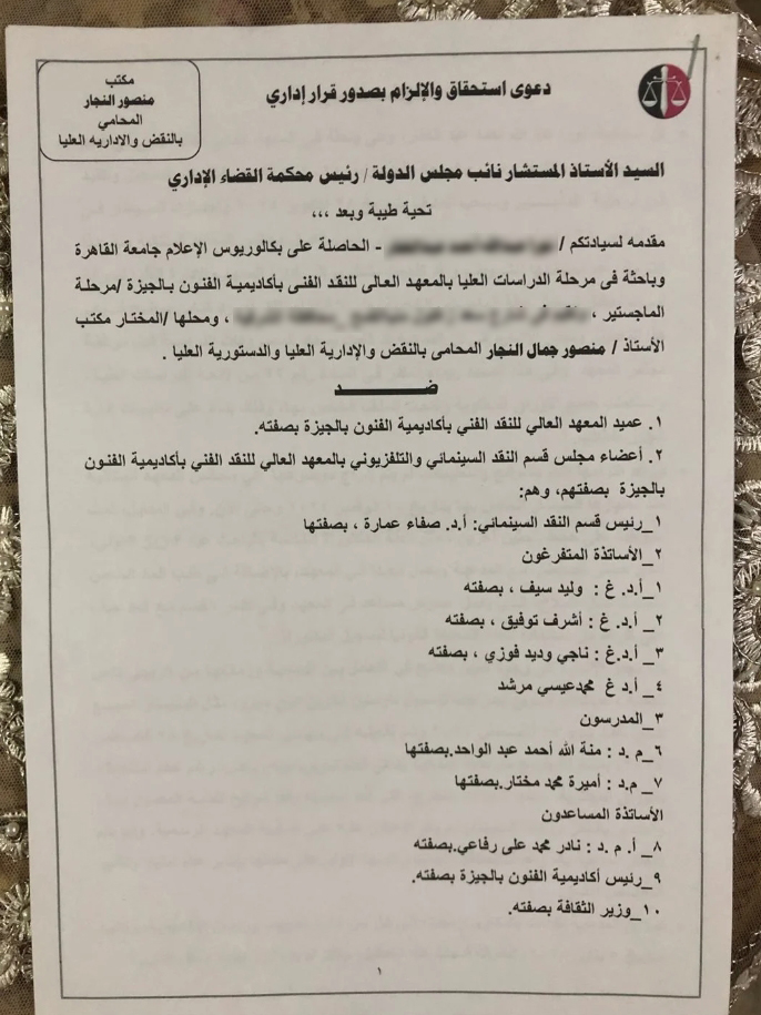 وتقدمت المدعية بشكاوى رسمية إلى كل من إدارة المعهد ورئيس الأكاديمية ونائبه بتاريخ 5 يناير 2025، لمعرفة أسباب التعطيل ولكن لم يتم الرد عليها بشكل كتابي، كما لجأت إلى لجنة فض المنازعات بتاريخ 26 يناير 2025 في محاولة لحل المشكلة، وتؤكد صحيفة الدعوى للباحثة بالمعهد العالى للنقد الفني بأكاديمية الفنون، أن ما شعرت به الباحثة من تعسف إداري تسبب لها في أضرار مادية ونفسية بالغة لها وأثر على مسارها الأكاديمي..ويبقى حق الرد مكفولاً لجميع من يهمه الأمر.
