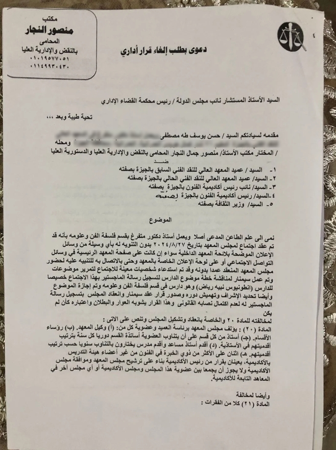 وتتناول صحيفة الدعوى، أنه نمى إلى علم المدعي الدكتور حسن يوسف طه – أستاذ متفرغ بقسم فلسفة الفن وعلومه – بأنه قد تم عقد اجتماع لمجلس المعهد بتاريخ 27/ 8/ 2024 بدون التنويه له بأى وسيلة من وسائل الإعلان الموضحة بلائحة المعهد الداخلية، سواء إن كانت على صفحة المعهد الرئيسية في وسائل التواصل الاجتماعي، أو على لوحة الإعلان الخاصة بالمعهد أو حتى بالاتصال به للتنبيه عليه لحضور مجلس المعهد المنعقد عمدا بدونه، - وحسبما ذكرت الدعوى – بأنه قد تم استدعاء شخصيات معينة للاجتماع لتمرير موضوعات، وتم عمل سيمنار لمناقشة خطة موضوع لأحد الدارسين في قسم فلسفة الفن وعلومه، وتم إجازة الموضوع، وأيضا تحديد الإشراف وتهميش دور المدعى، وصدور قرار عقد سيمنار وانعقاد المجلس بتسجيل رسالة الماجستير له، لعدم اكتمال نصابه القانوني، وهذا القرار يشوبه العوار والبطلان واعتباره كأن لم يكن لمخالفته للمادة (20) و(21) والخاصة بانعقاد وتشكيل المجلس.