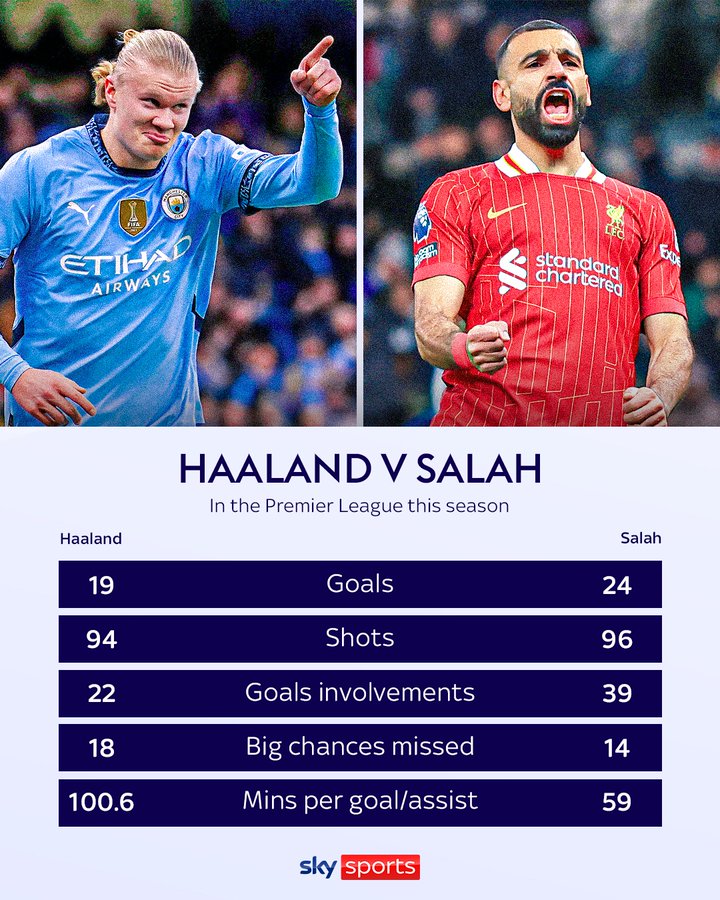 وتفوق صلاح من حيث التسجيل برصيد 24 هدفا مقابل 19 لهالاند ومن حيث التسديد برصيد 96 تسديدة مقابل 94 لمهاجم السيتي.