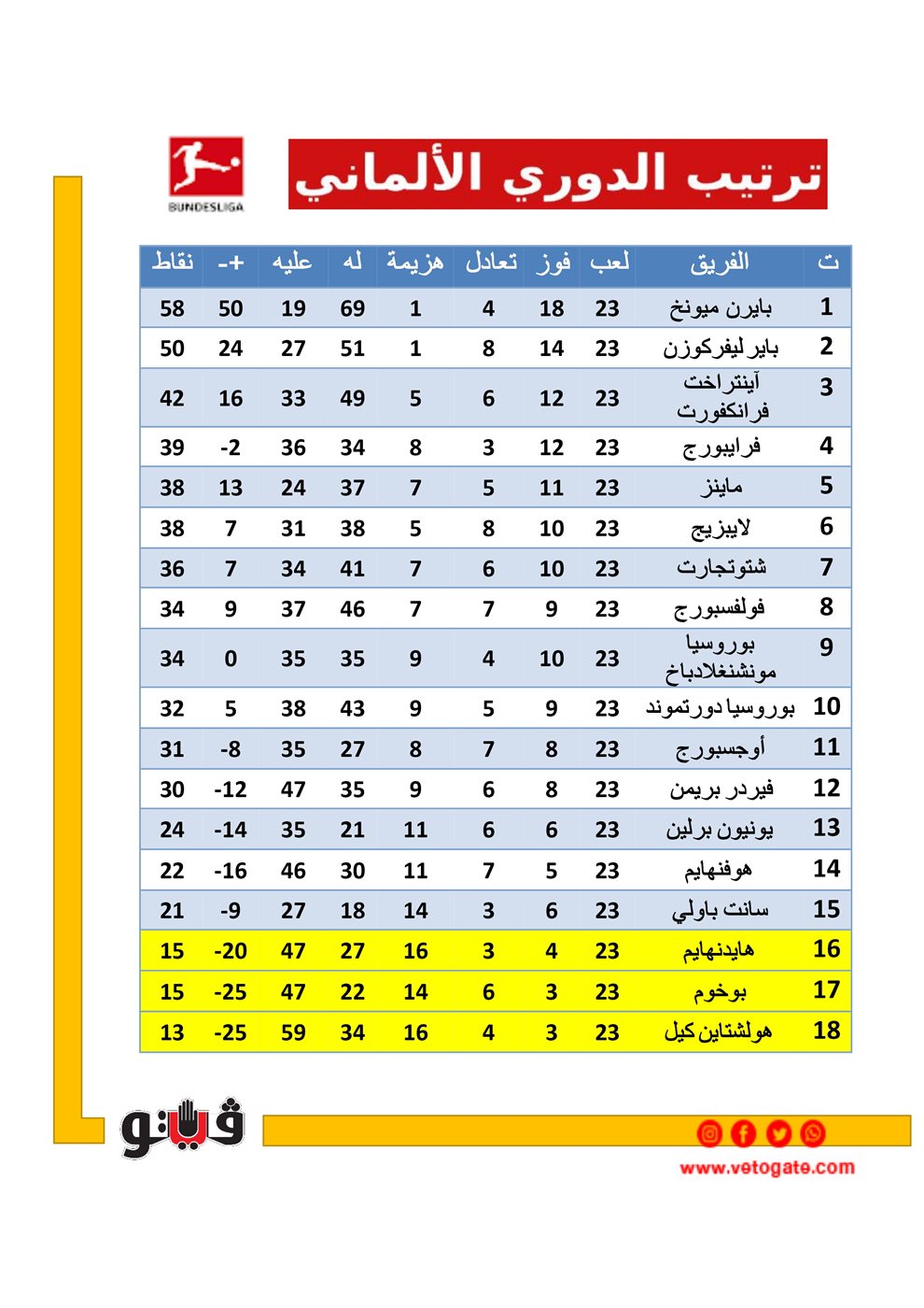 ترتيب الدوري الألماني، واصل بايرن ميونخ تصدر جدول الدوري الألماني 2025 بعد مرور الجولة الـ 23 بفارق 8 نقاط عن باير ليفركوزن حامل لقب البوندسليجا بالموسم الماضي.