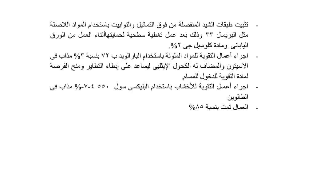 - تم تثبيت طبقات الشيد المنفصلة من فوق التماثيل والتوابيت باستخدام المواد اللاصقة مثل البريمال 33 وذلك بعد عمل تغطية سطحية لحمايتها أثناء العمل من الورق الياباني ومادة كلوسيل جي 2%، وإجراء أعمال التقوية للمواد الملونة باستخدام البارالويد ب 72 بنسبة 3% مذاب في الاسيتون والمضاف له الكحول الإيثليى ليساعد على إبطاء التطاير ومنح الفرصة لمادة التقوية للدخول للمسام، وتم إجراء أعمال التقوية للأخشاب باستخدام البليكسي سول.