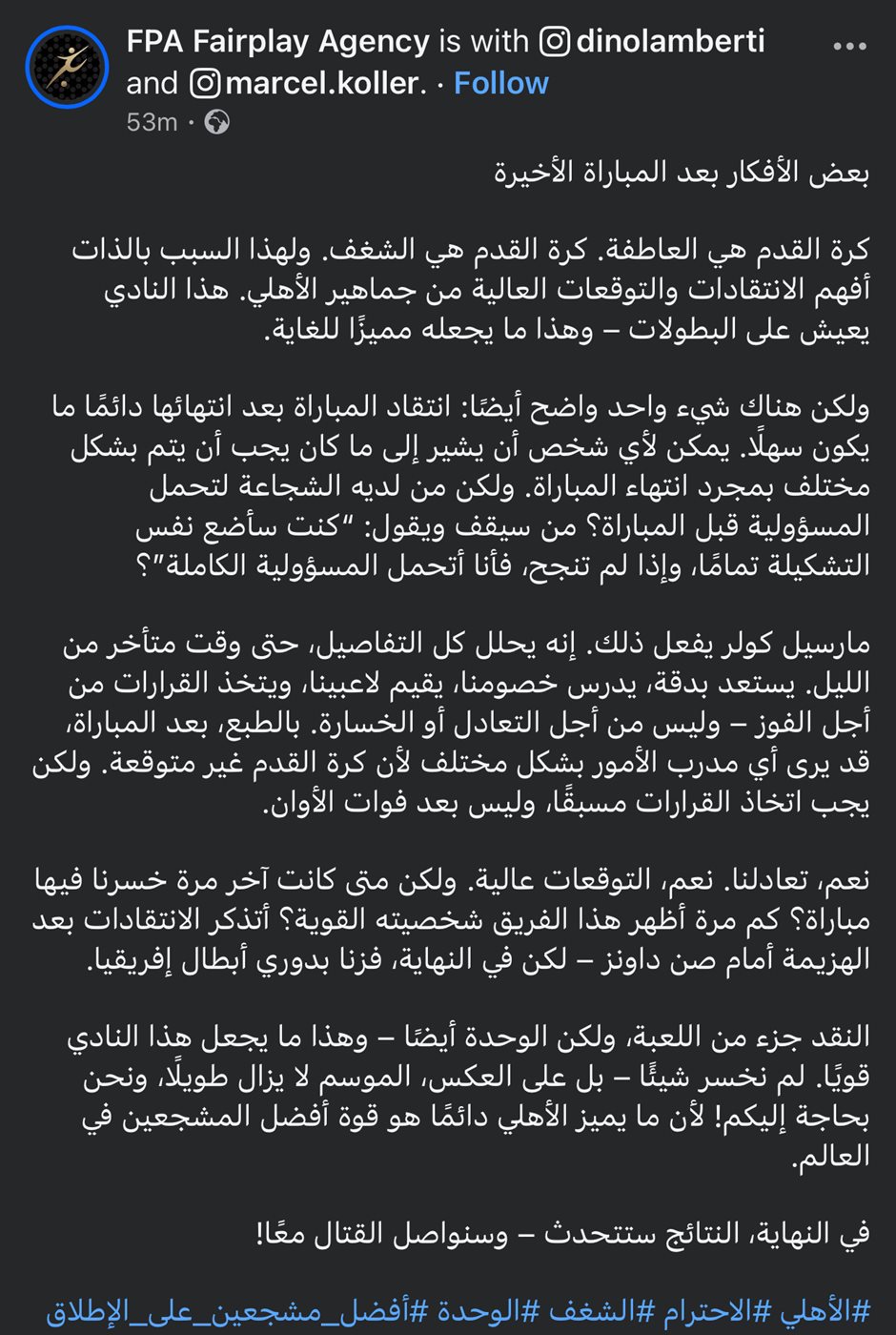 وزاد " النقد جزء من اللعبة، ولكن الوحدة أيضًا – وهذا ما يجعل هذا النادي قويًا. لم نخسر شيئًا – بل على العكس، الموسم لا يزال طويلًا، ونحن بحاجة إليكم! لأن ما يميز الأهلي دائمًا هو قوة أفضل المشجعين في العالم.