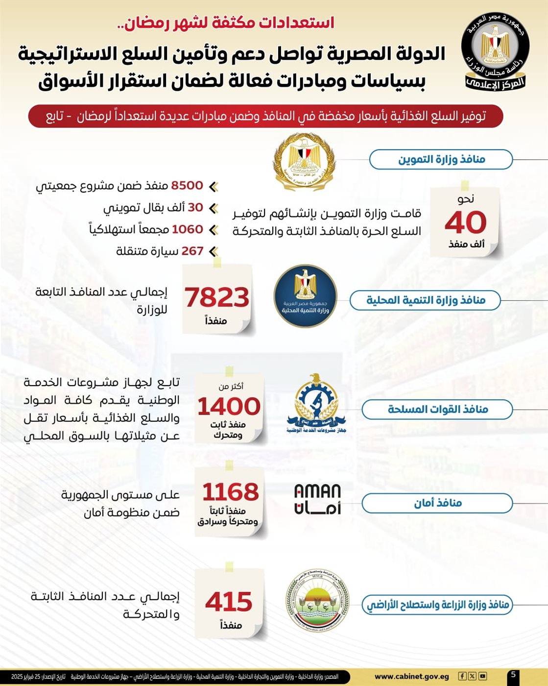 في إطار التزام الدولة المصرية بالحفاظ على الأمن الغذائي وضمان استقرار الأسواق، بالرغم من التحديات الاقتصادية العالمية، تواصل الدولة جهودها لتعزيز الإنتاج المحلي، والاحتياطي الاستراتيجي من السلع الأساسية، من خلال تنفيذ مشروعات قومية كبرى لتعزيز الإنتاج الزراعي والحيواني والداجني، فضلًا عن تطوير سياسات متكاملة لتحسين كفاءة الإنتاج وتعزيز سلاسل الإمداد، وعلى صعيد متصل تكثف الدولة استعداداتها لاستقبال شهر رمضان عبر حزمة من المبادرات والإجراءات التي تضمن إتاحة السلع الأساسية بأسعار مخفضة، هذا إلى جانب التوسع في المنافذ والمعارض لضمان توفير بدائل متنوعة تلبي احتياجات مختلف الفئات، وذلك بالتنسيق بين الجهات المعنية وبالتعاون مع القطاع الخاص.