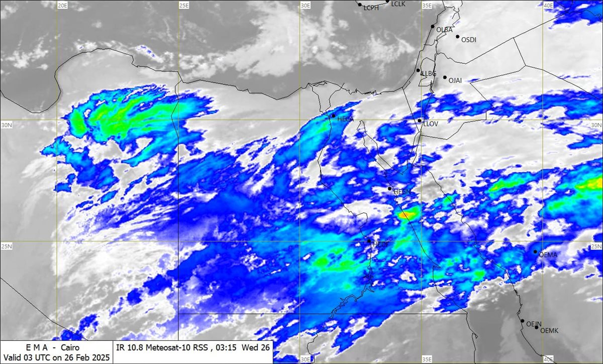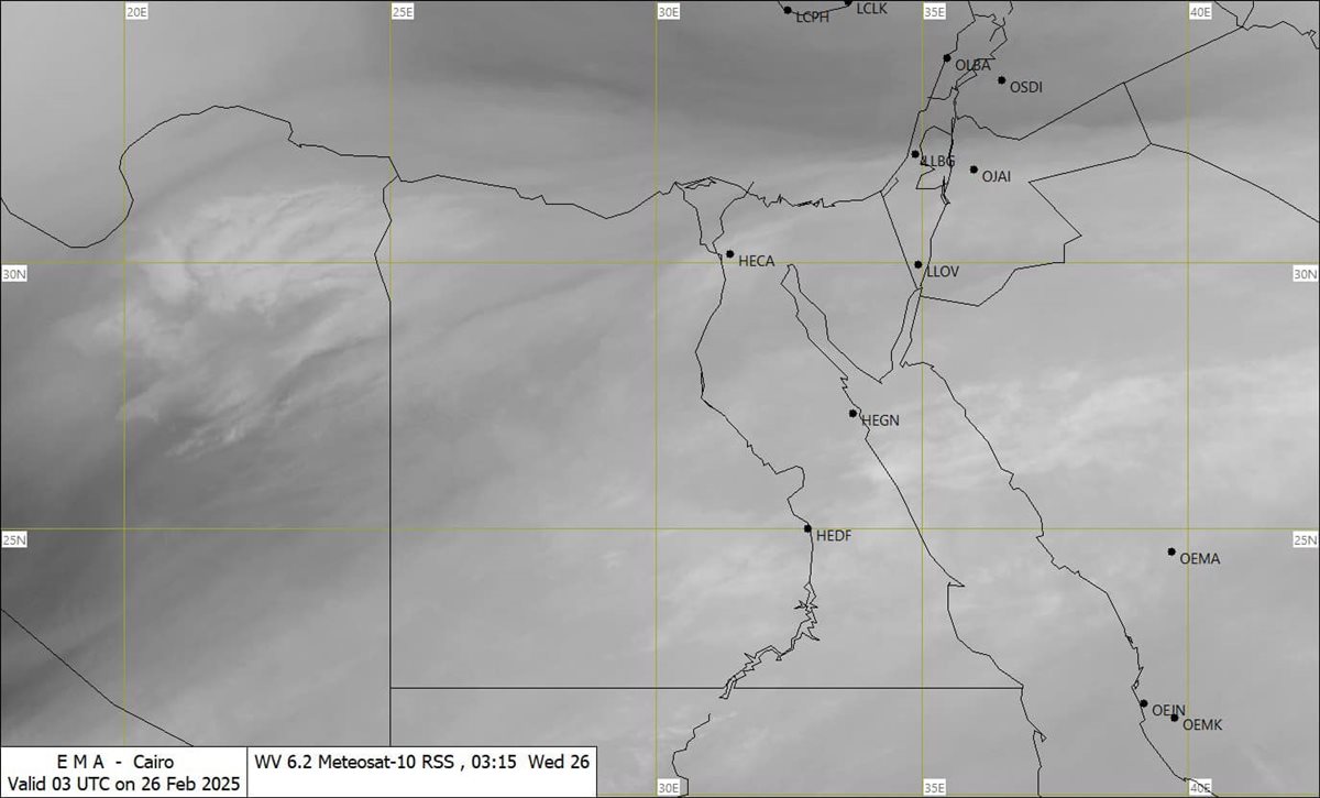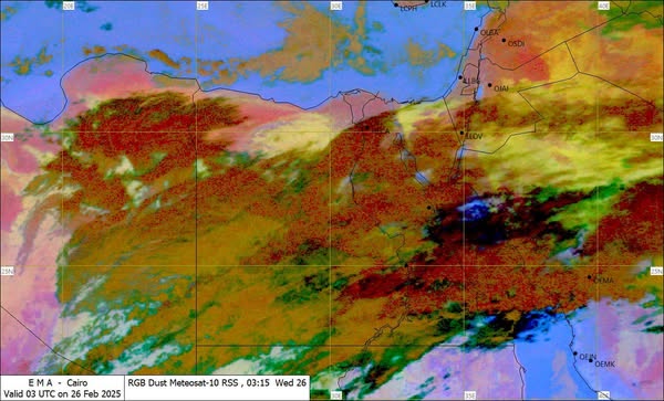 وقالت الأرصاد في بيان إن آخر صور الأقمار الصناعية تشير إلى غطاء سحابي من السحب المنخفضة والمتوسطة والركامية على مناطق من الصحراء الغربية وشمال وجنوب الصعيد.