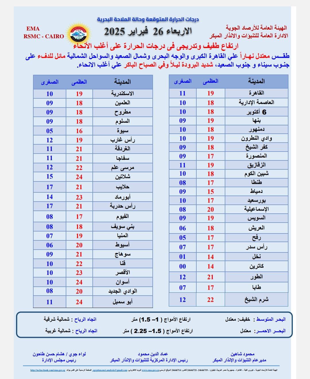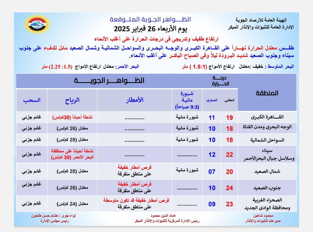 ونشرت هيئة الارصاد بيانا بدرجات الحرارة المتوقعة اليوم الأربعاء، على مدن ومحافظات مصر، وجاءت كالتالي: