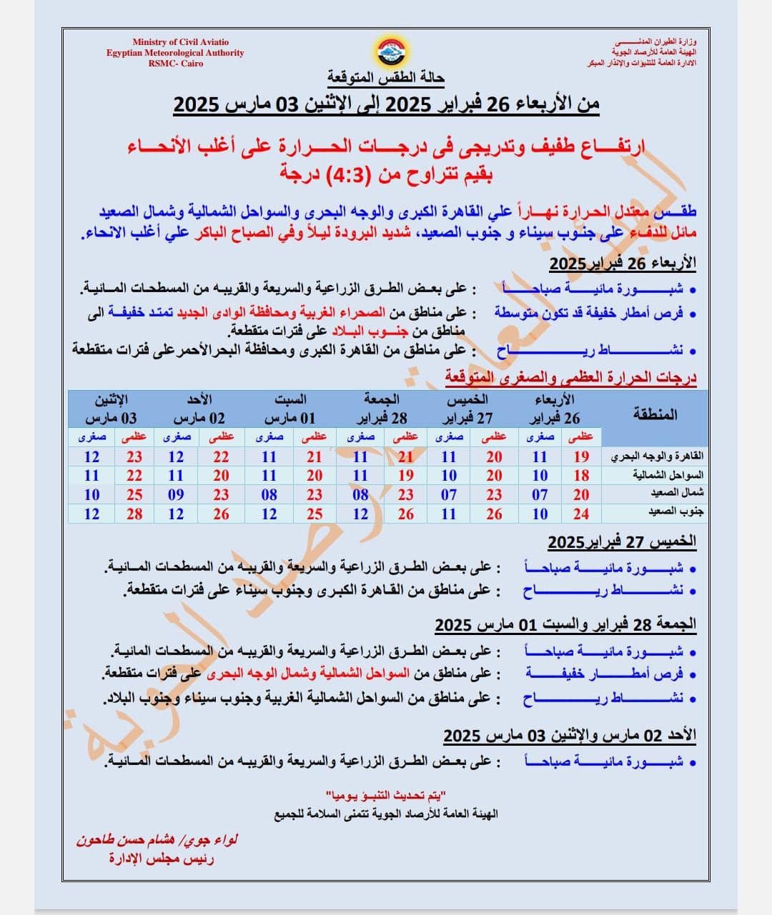 أما طقس الجمعة 28 فبراير والسبت 1 مارس 2025 توقعت هيئة الأرصاد الجوية شبورة مائية صباحا على بعض الطرق الزراعية والسريعة والقريبة من المسطحات المائية، وفرص أمطار خفيفة على مناطق من السواحل الشمالية وشمال الوجه البحري على فترات متقطعة.