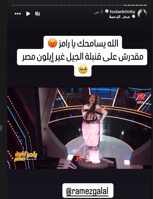 وكتبت هدى الإتربي عبر خاصية الستوري على إنستجرام، بعد نشر مقطع الفيديو لجزء من برومو برنامج "رامز إيلون مصر": "الله يسامحك يا رامز ما يقدرش على قنبلة الجيل غير إيلون مصر"