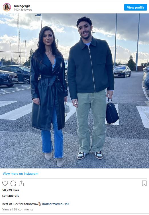 ونشرت سونيا جرجس صورة لها مع عمر مرموش، قبل مباراة مانشستر سيتي ضد ليفربول، عبر حسابها الرسمي على "إنستجرام"، متمنية له التوفيق في مسيرته مع فريقه الجديد.