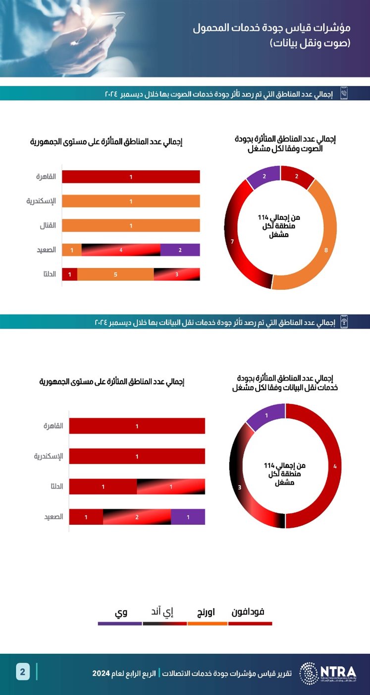 • فودافون: من أصل 114 منطقة (مدينة وحي) تم إجراء اختبارات القياس عليها، تم رصد تحسن في عدد المناطق التي تعاني من سوء جودة مؤشرات خدمات الصوت لتبلغ منطقتين خلال شهر ديسمبر لعام 2024 مقارنًة بعدد 6 مناطق خلال شهر أكتوبر لعام 2024.