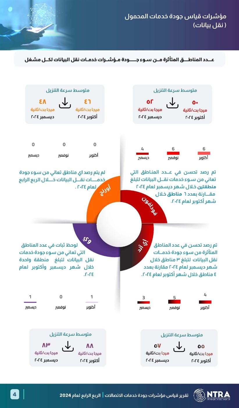 فيما يلي إجمالي أعداد المناطق (المدن والأحياء) التي تم رصد أنها تعاني من تجاوزات مؤشرات جودة خدمات البيانات خلال الربع الرابع لعام 2024: