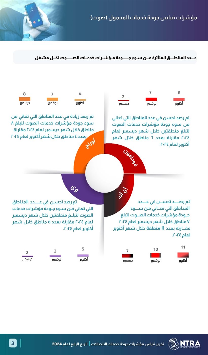• اورنج: من أصل 114 منطقة (مدينة وحي) تم إجراء اختبارات القياس عليها، تم رصد زيادة في عدد المناطق التي تعاني من سوء جودة مؤشرات خدمات الصوت لتبلغ 8 مناطق خلال شهر ديسمبر لعام 2024 مقارنًة بعدد 4 مناطق خلال شهر أكتوبر لعام 2024.